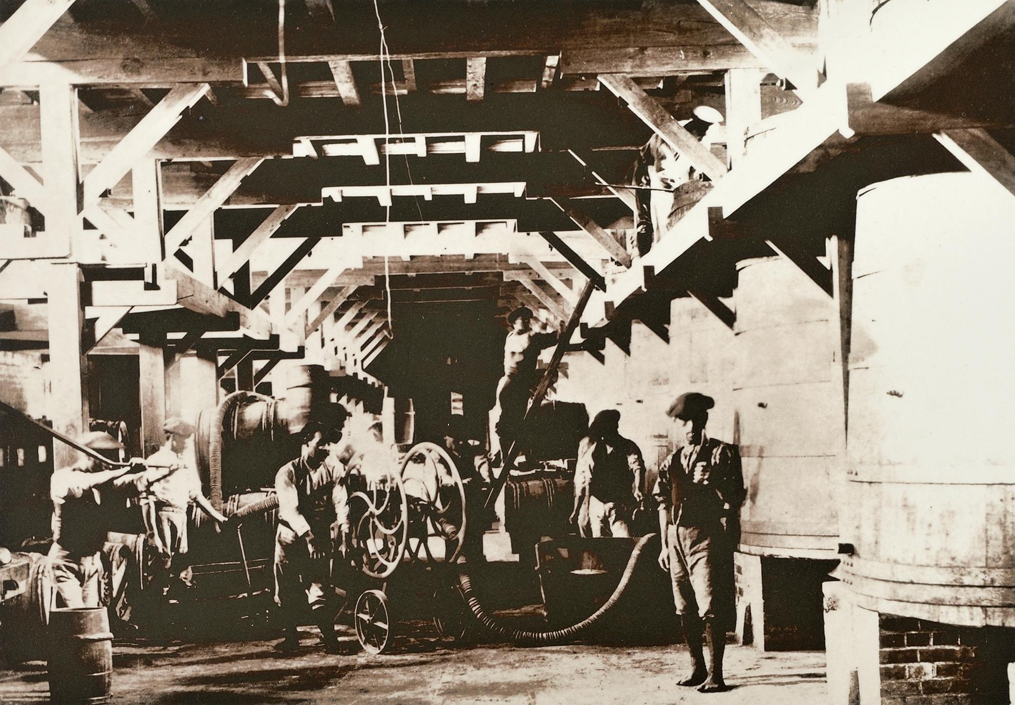 本日の画像は、明治40年頃の旧醗酵室1階での作業風景です。ベレー帽のような帽子をかぶり、作業着もお洒落です。まるでフランスのワイナリーのような雰囲気が出てます。