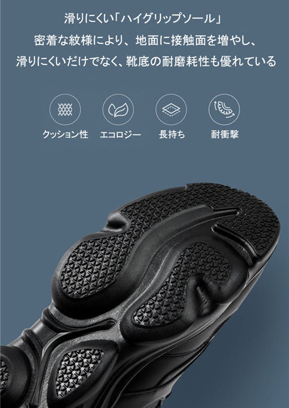 ●凹凸アウトソールで滑りを防止、着地時の衝撃を吸収し膝の負担を減らす