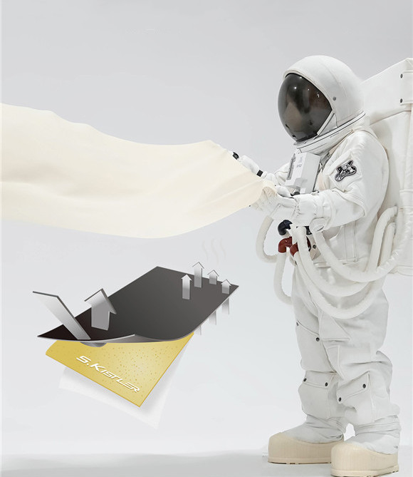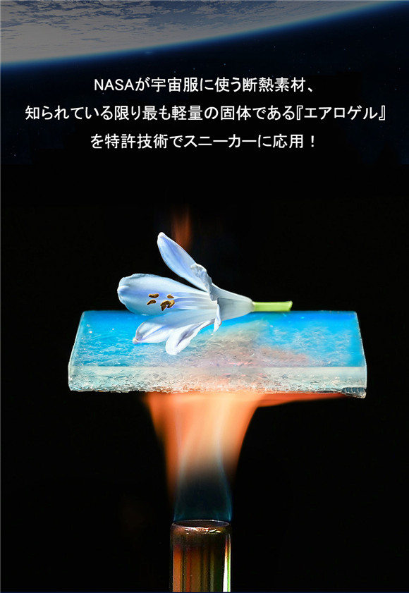 ※エアロゲル (aerogel) は、ゲル中に含まれる溶媒を超臨界乾燥により気体に置換した多孔性の物質であるため、通気性抜群を持っています。アクティブに動いて汗をかいても蒸れない構造です。エアロゲルは断熱性に優れた素材で、米航空宇宙局(NASA)が宇宙服に使用していることで知られています。宇宙服は断熱と動きやすさの両方が求められるため、その両方を実現する素材を長年にわたって研究開発していました。高低温を遮断できるエアロゲルという革新的な素材を宇宙服に応用しました。