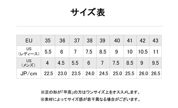 ※サイズ感は個人差がありますので、甲高幅広足の方はワンサイズ上のサイズをおすすめします。