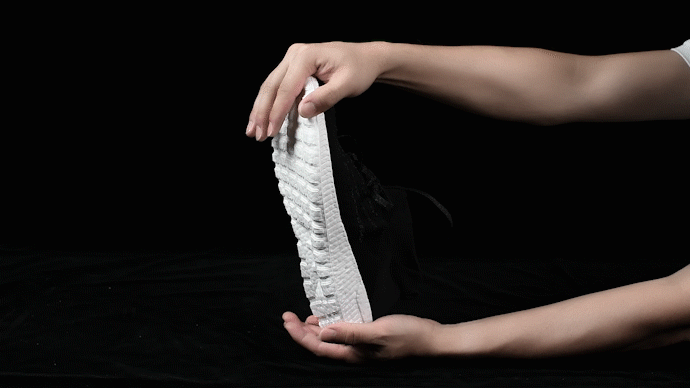 衝撃を吸収した後は反発力により元の形に戻ることで、ポップコーンのようにはじけるような弾力性により、アクティブな動きを補助します。