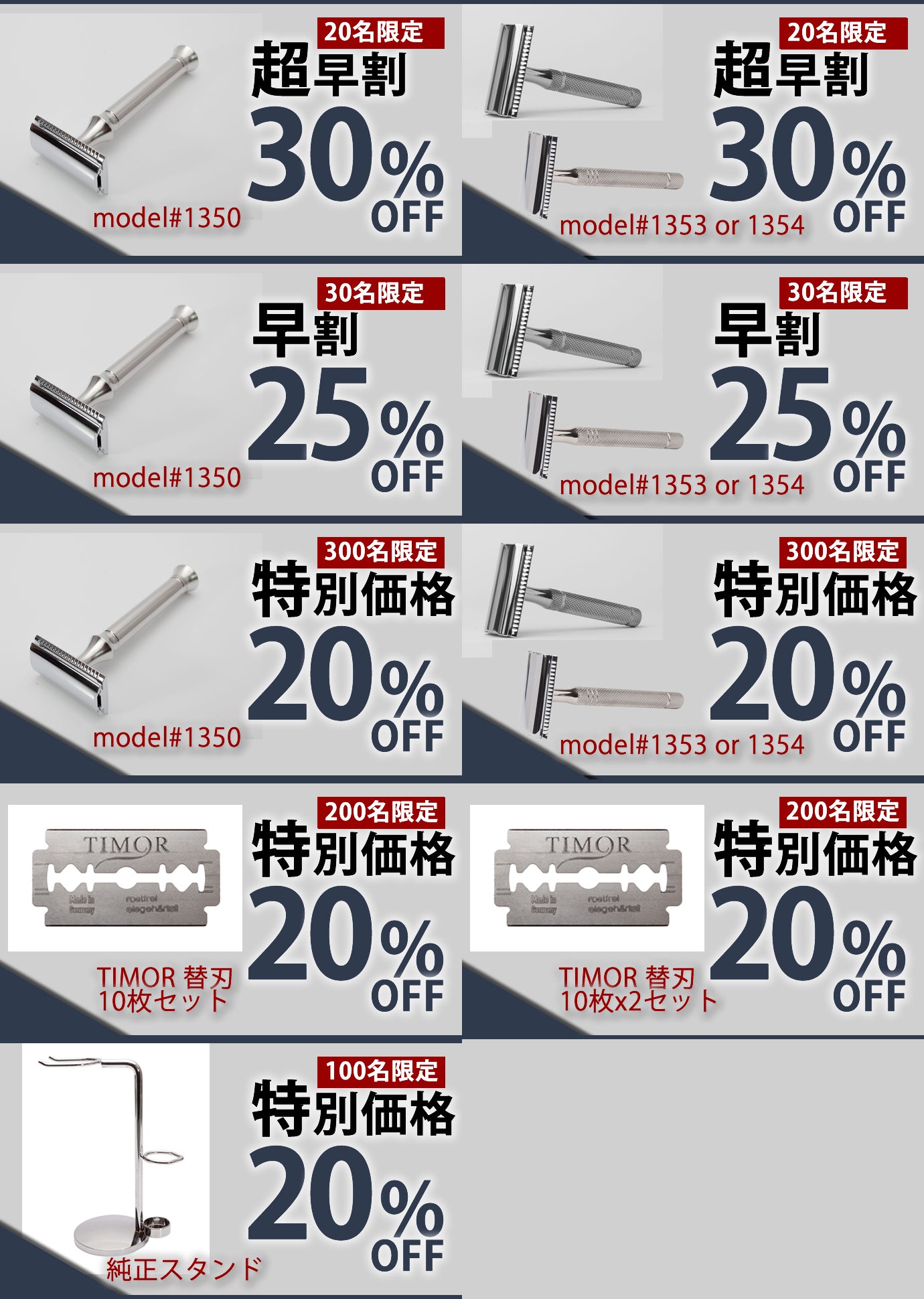 ■ モデル1350にはTimor替刃10枚、その他のモデルにはTimor替刃1枚付属。