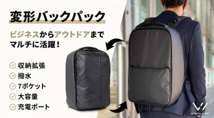 こちらはCORAL WEP様のプロダクトで、「毎日の通勤・ジム通い・旅行などの様々なシーンで、1つのバッグを使いまわしたい」という願いを叶える、変形バックパックです。
