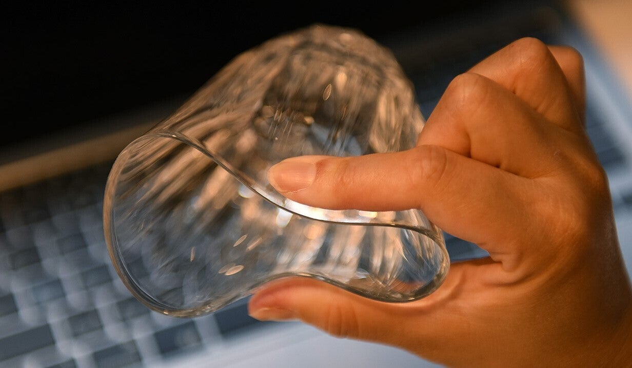 このグラスの最大の特徴。それは、素材がシリコンゴムなので「グニャ」っと曲がることです!