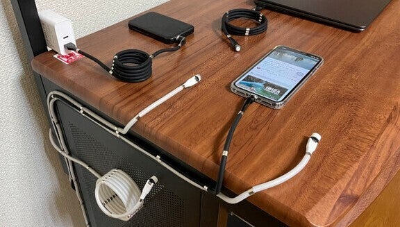 こちらは0.9mと1.8mの2種類をご用意しました。2種類のケーブルをうまく使えば、デスク周りのコードがこんなにも綺麗にまとまります!