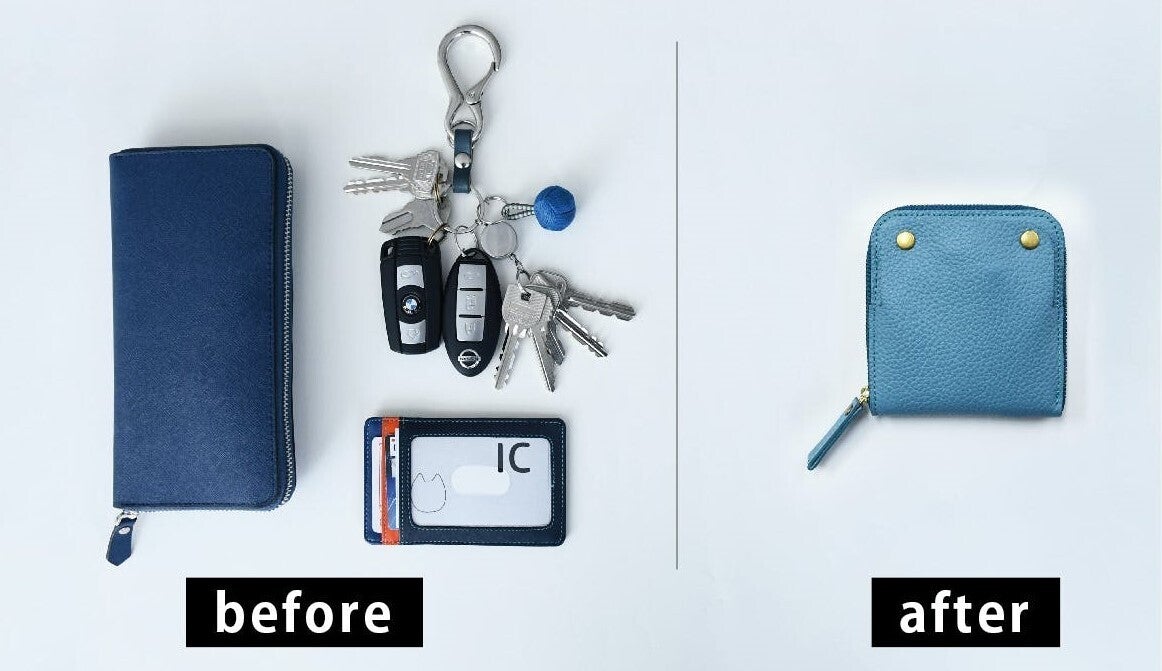 こちらは、小さい財布では入りきらない、スマートキー、財布、キーケースが「ほぼ全部入る」10cmの角コンパクト本革ケースです。