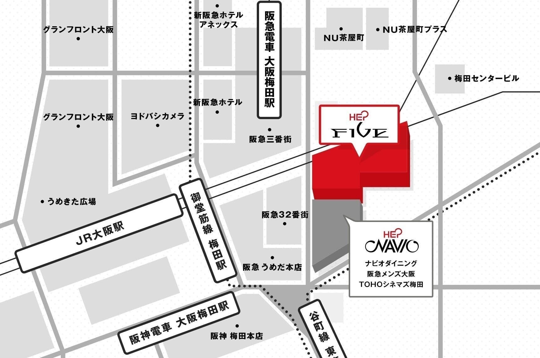 なお、HEP FIVEの最寄り駅および周辺の地図は、上の画像の通りです。