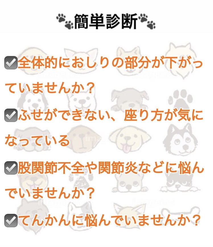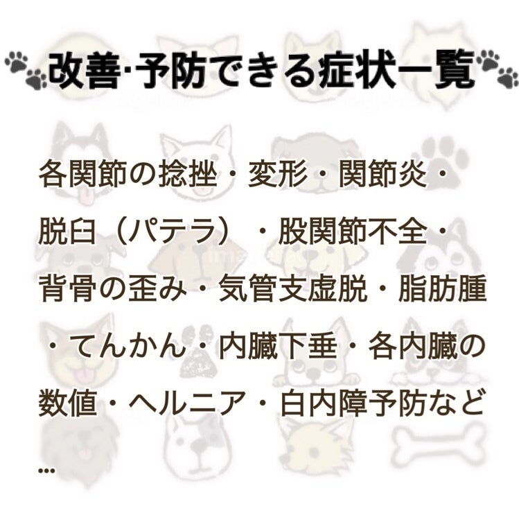 そして犬に多く見られる脱臼や股関節不全、パテラといった症状のある歩けなくなってしっまた子たちも歩けるまでのケアをしていきたいと思っています。