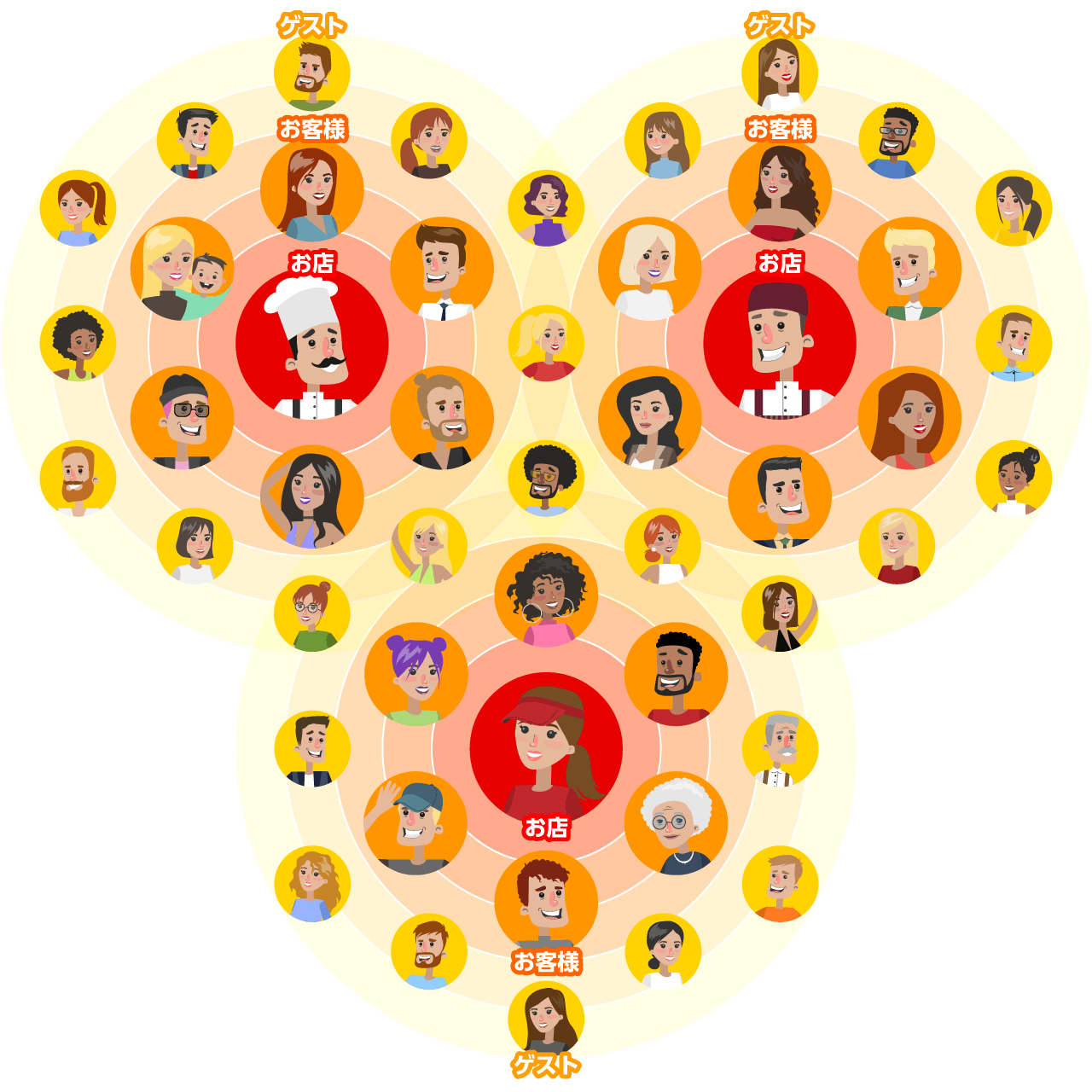 この図は、お店ユーザーを中心として、お客様ユーザーがそれを取り囲み、そしてゲスト(非会員ユーザー)にまで波及する相関を表したものになります。