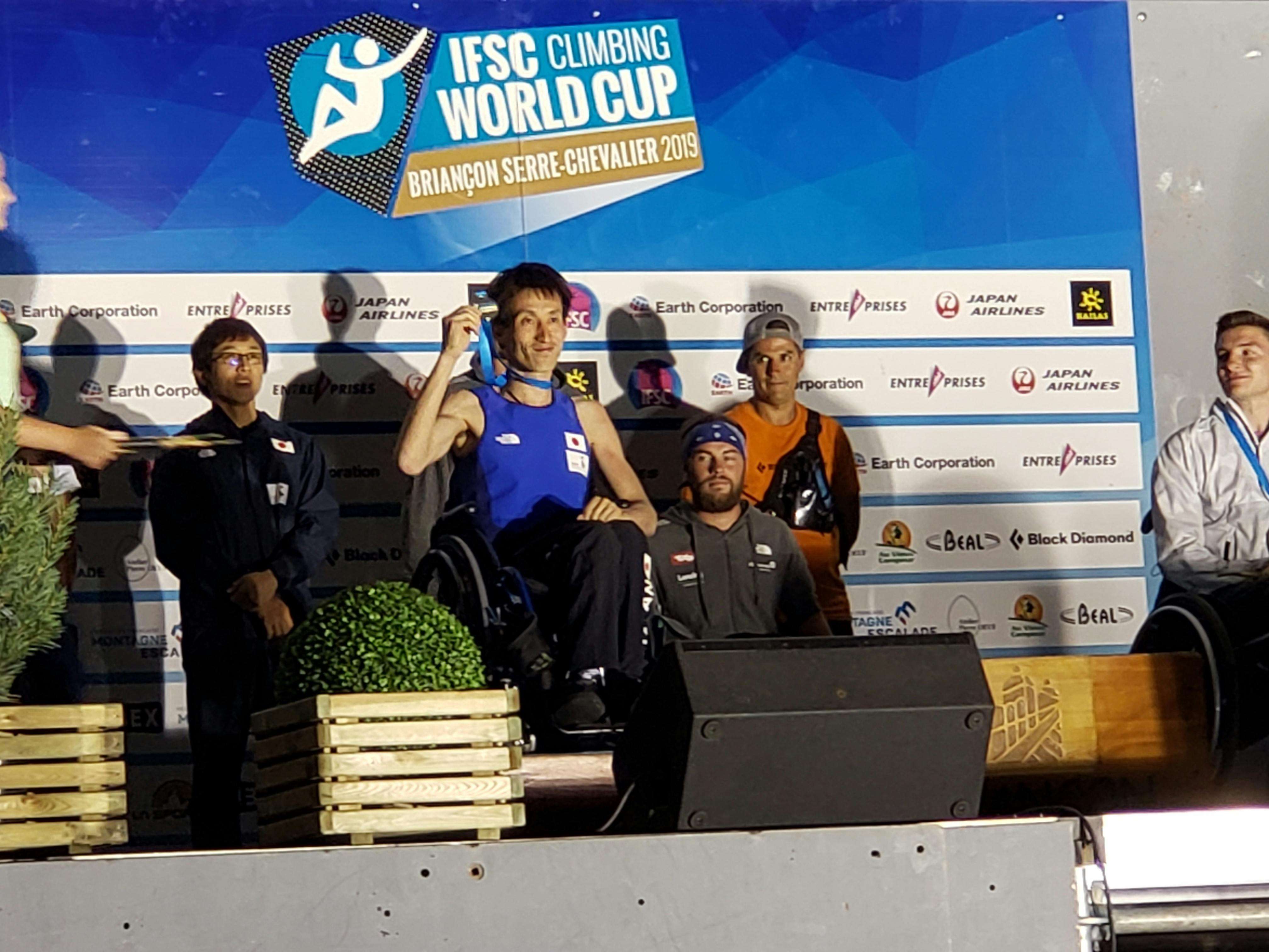 そして、2019年にフランス・ブリアンソンで開催されたパラクライミング世界選手権に日本代表として出場させていただき、世界各国から車いすクライマーが出揃い、車いすクライマーだけのカテゴリーで戦いました。チームジャパン・日本から応援してくれてる方々、現地の方々の声援のおかげで一手一手登っていくことができ、準優勝することができ銀メダルを獲得しました。
