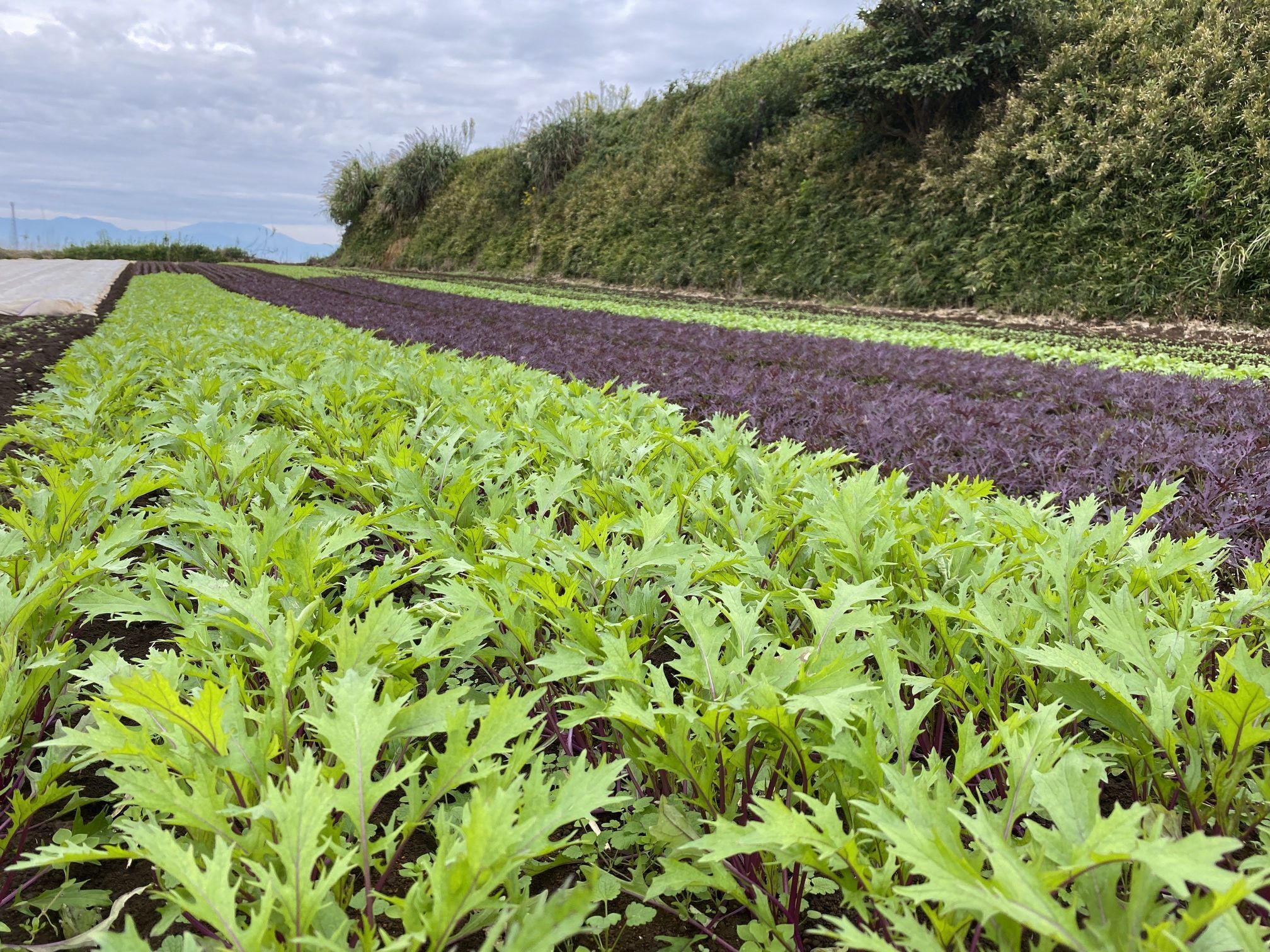 2020/12/17 14:22緑色の葉に茎が赤紫色の『赤水菜』と、赤紫色の葉が目立つ『赤サラダからし菜』の畑です。絵になる野菜です。野菜の名前:赤水菜特徴:茎の部分が赤紫色で、葉の部分が緑でとても綺麗な水菜です。クセが少なくシャキシャキとした食感です。紫色の理由はポリフェノールの一種アントシアニンを多く含んでいるからです。生のままサラダにも、おひたしや鍋にも! 野菜の名前:赤サラダからし菜特徴:紫色が色鮮やかでサラダの彩りを引き立てます!歯ざわり良く、名前にからし菜と有りますが、それほどパンチはありません、程よい辛さです。尚、茹でると色が抜けて緑になります。サラダがお勧めです。野菜の名前:カステルフランコ特徴:イタリア野菜のひとつで、チコリの仲間です。『ウインターローズ(冬のバラ)』など、美しい愛称があります。エンダイブとラディッキオ・トレビーゾの交配種と言われ、栽培の終盤期に、葉に直射日光を当てないように軟白栽培を行い、クロロフィル(葉緑素)を除去することで、美しいクリーム色の葉色と滑らかな舌触り、ほろ苦さの中のほのかな甘みが醸し出されます。葉の色目を生かしたサラダにしたり、サンドイッチにしたり、いろんな用途があります。葉を1枚添えるだけで、一段上のお皿になること請け合いです。 もっと見る本日の三浦野菜(12/14)