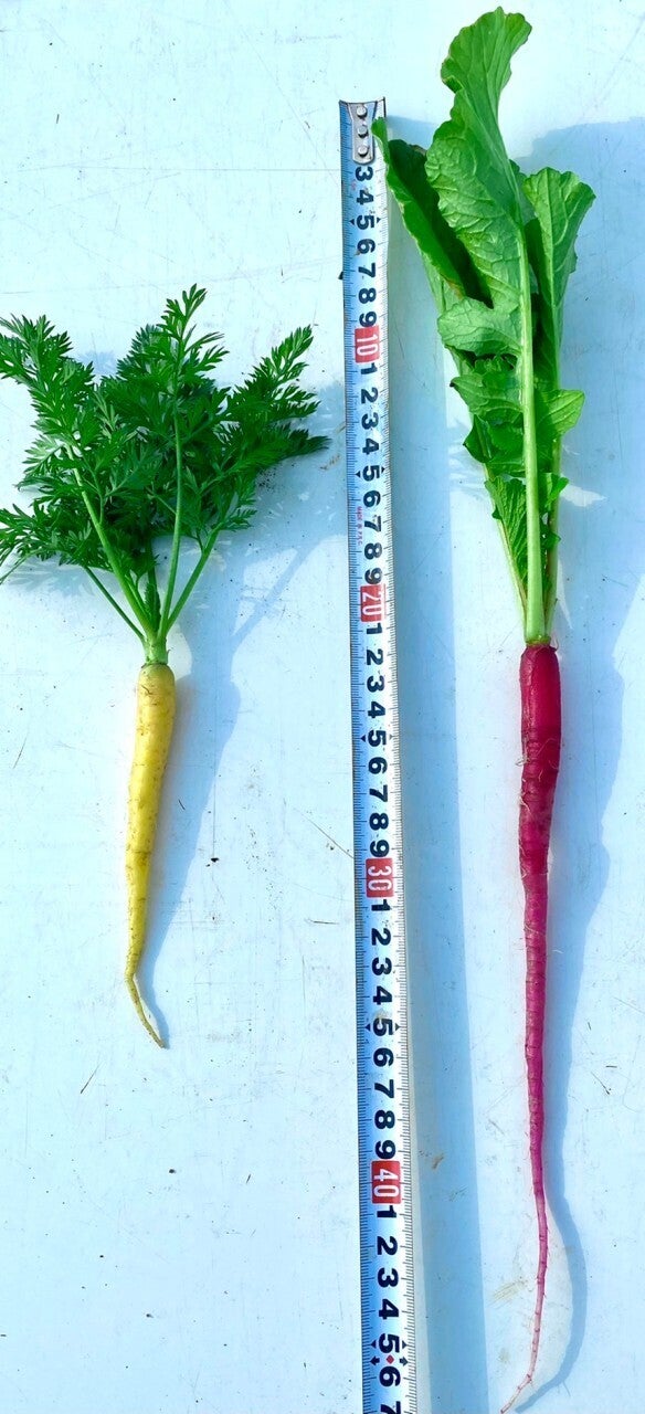 写真は黄色ミニ人参(左)とキャンドルファイヤー(ミニ大根)(右)いずれも、お皿を楽しく演出するのに大人気の野菜です。 本日は、ミニ大根シリーズをご紹介。野菜の名前:キャンドルファイヤー特徴: 鮮やかな赤も美しいミニ大根。蝋燭の炎の様に見立てて名付けています。歯切れがよく、サラダ、バーニャカウダ、ピクルス等、使い道が多いです。飲食店様から非常に引き合いの強いミニ大根シリーズ。畑に限定3000本あるだけなので、少しだけでもお届け出来たらと願っています。野菜の名前:紅白ミニ大根特徴:紡垂型で実が紅白に色付く美しい大根です。 そのままでも、かじっても、色目を生かして縦にカットして飾ったり。さっと浅漬けピクルスにしたりと使い勝手いいミニ大根です 。可愛らしいサイズなので、こちらも飲食店様から大量注文が入ります。何とか年内出荷まで持てば、お届けしたいです!野菜の名前:カラフルラレシ特徴:ピンポン玉のように丸く、彩りも綺麗なラレシです。実は白色が一番数が出ないそうで、入っていたら、ラッキーです!上記2種類と合わせて、是非、皆様にクリスマス向けにお届けしたいしたい品です。少しあるだけでも、巣ごもりパーティーのお皿を賑やかにしてくれるアイテムです!収穫してから洗浄して梱包まで、極力葉付きで、お届けする為、手間を掛けています。