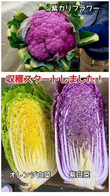 鮮やかな色目で目を引く野菜として、紫カリフラワーや紫白菜は、本当にインパクトが有ります!紫カリフラワーは茹でるとグレーがかった青になり、そのままでは、いまひとつ美味しそうには見えませんが、ピクルス液につけると、鮮やかに赤く発色します!オレンジ白菜は、食べたら甘味が伝わるので、サラダや水炊きなどがお勧めですね。このオレンジ色は植物色素のカロテノイドによるもので、更にシスリコピンという一般的な白菜には含まれない色素が豊富に含まれ、強力な抗酸化機能があるそうです。紫白菜の紫は、紫カリフワラー同様のポリフェノールの1種アントシアニンです。抗酸化作用があるとして知られており、茹でずに、サラダ向きで召し上がって下さい。甘くてみずみずしいです。(茹でると色抜けします、、、)