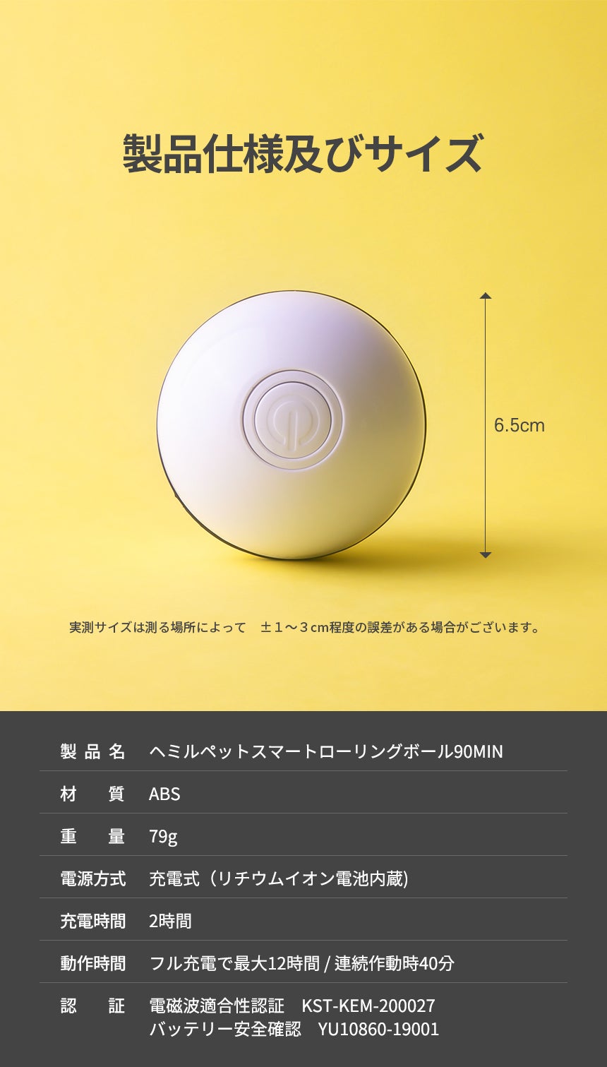 「へミルペットスマートローリングボール90min」は5分間遊んでから、自動で90分間休憩モードに入ります。90分経つと自動で5分間遊びを繰り返し続けてくれる”90minアルゴリズム”方式を採用した大切なペットのスマートトイです。