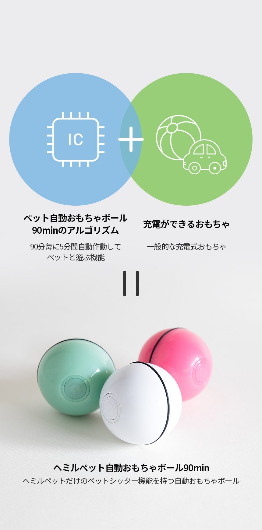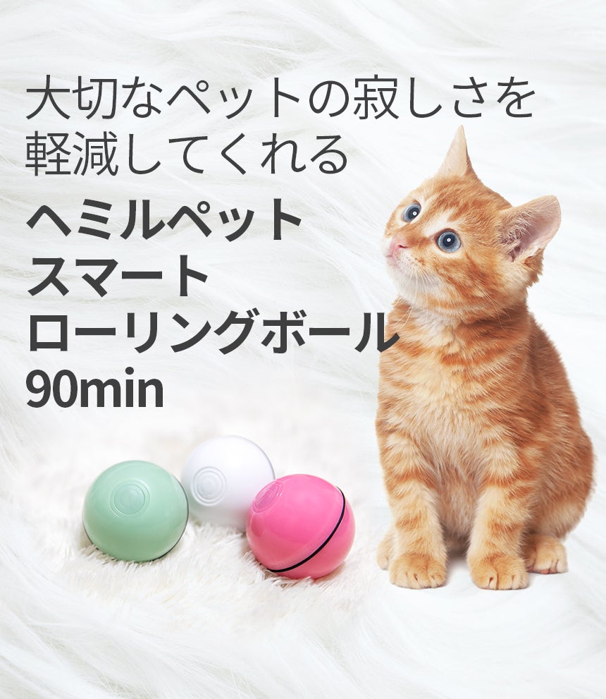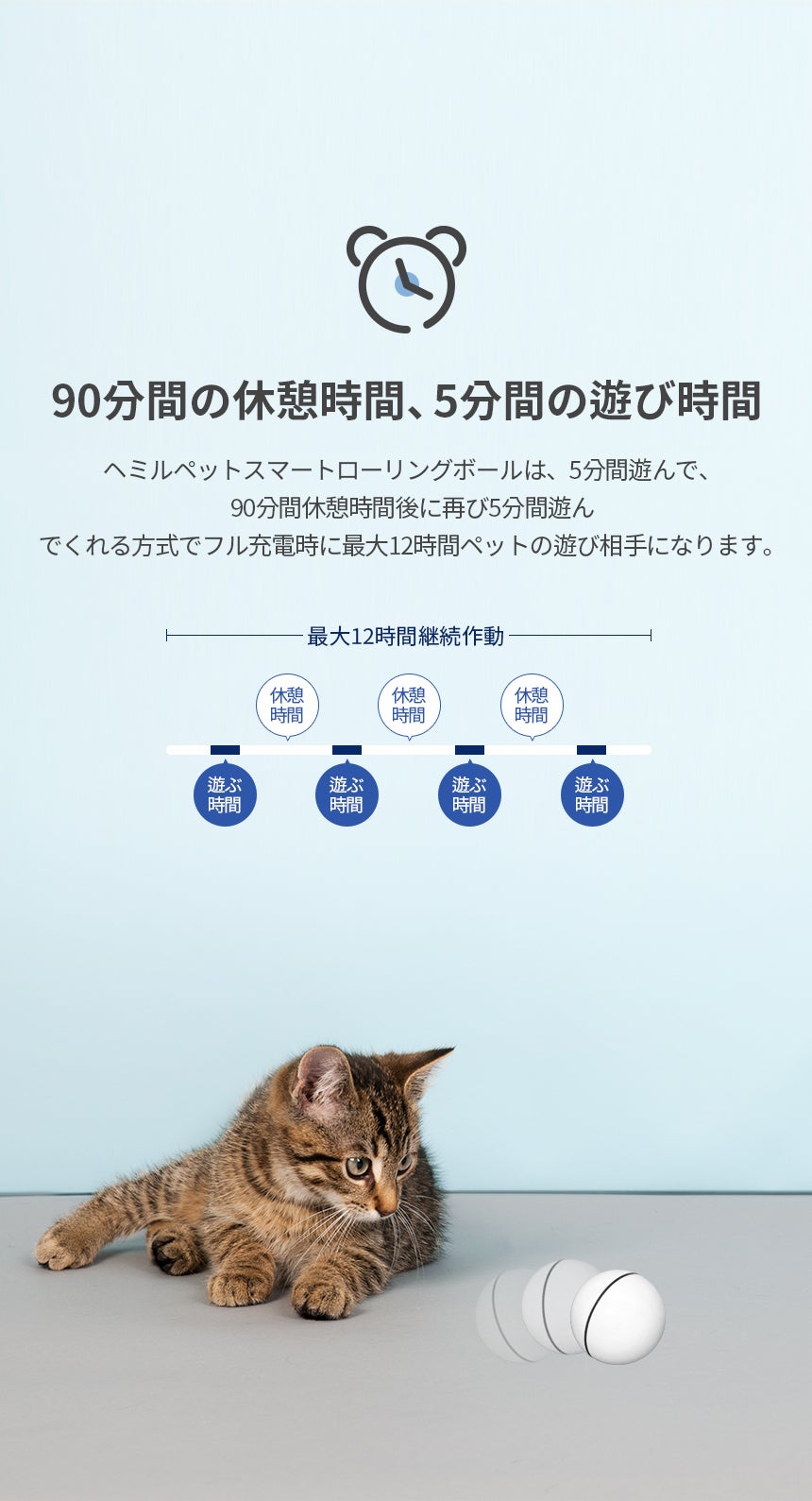 「へミルペットスマートローリングボール90min」は5分間遊んでから、自動で90分間休憩モードに入ります。90分経つと自動で5分間遊びを繰り返し続けてくれる”90minアルゴリズム”方式を採用した大切なペットのスマートトイです。