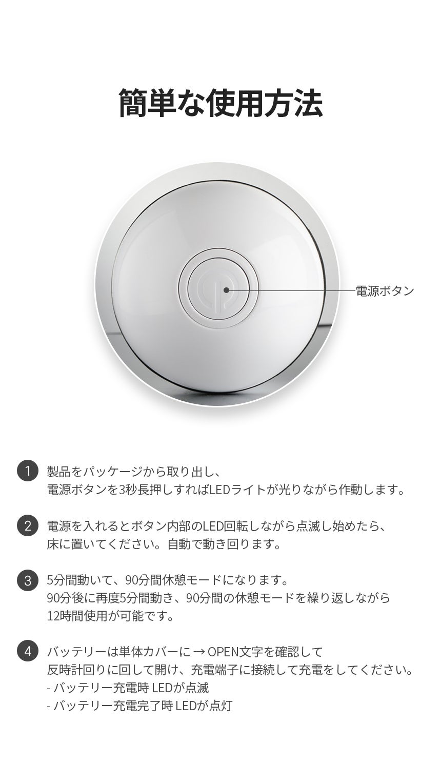 連続作動をさせる場合は、手動で電源をON/OFFにしてください。約40分程度連続で動き回ります。