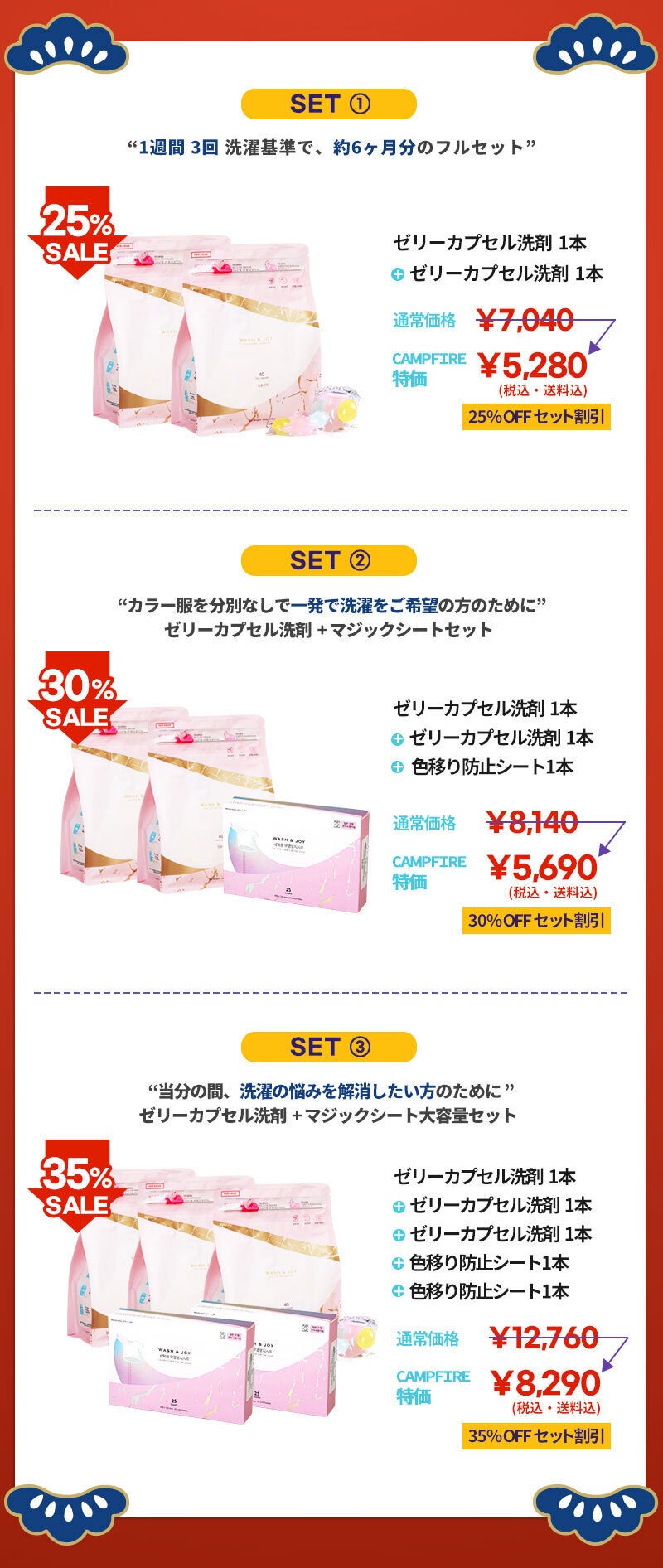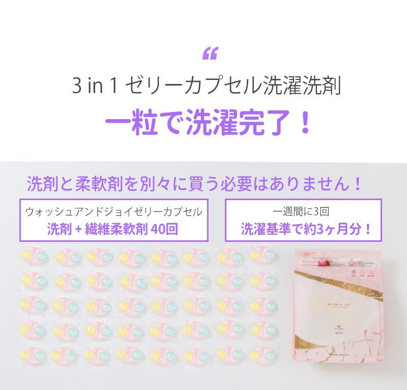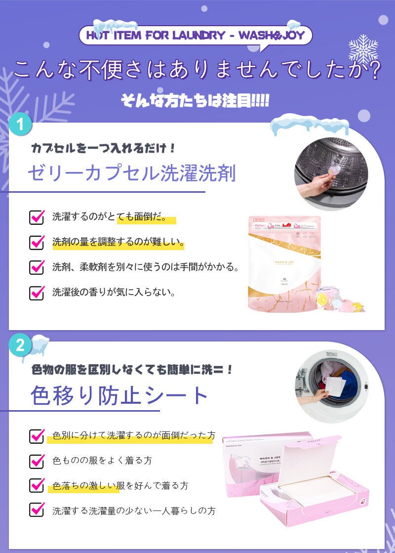 3in1 ゼリーカプセル洗剤+色移り防止シートセットで、洗濯を簡単、お手軽にしてみてください!