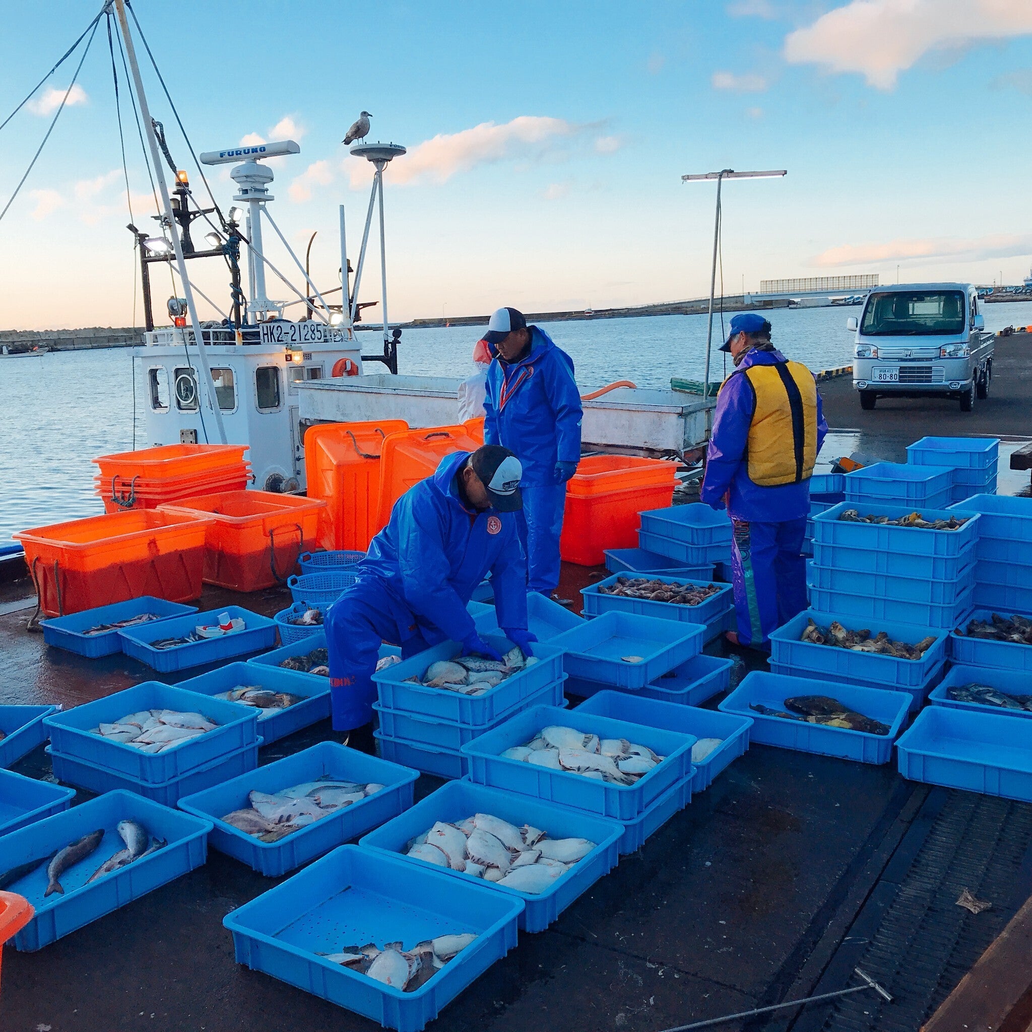 北海道は根室の漁港にて水揚げされた魚を仕分け作業中。