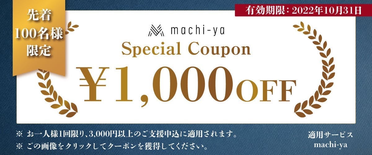 下記URLよりアクセスいただくことで、3,000円以上のご支援で使用可能なスペシャルクーポンをお受け取りいただけます。是非、この機会にお受け取り下さい。