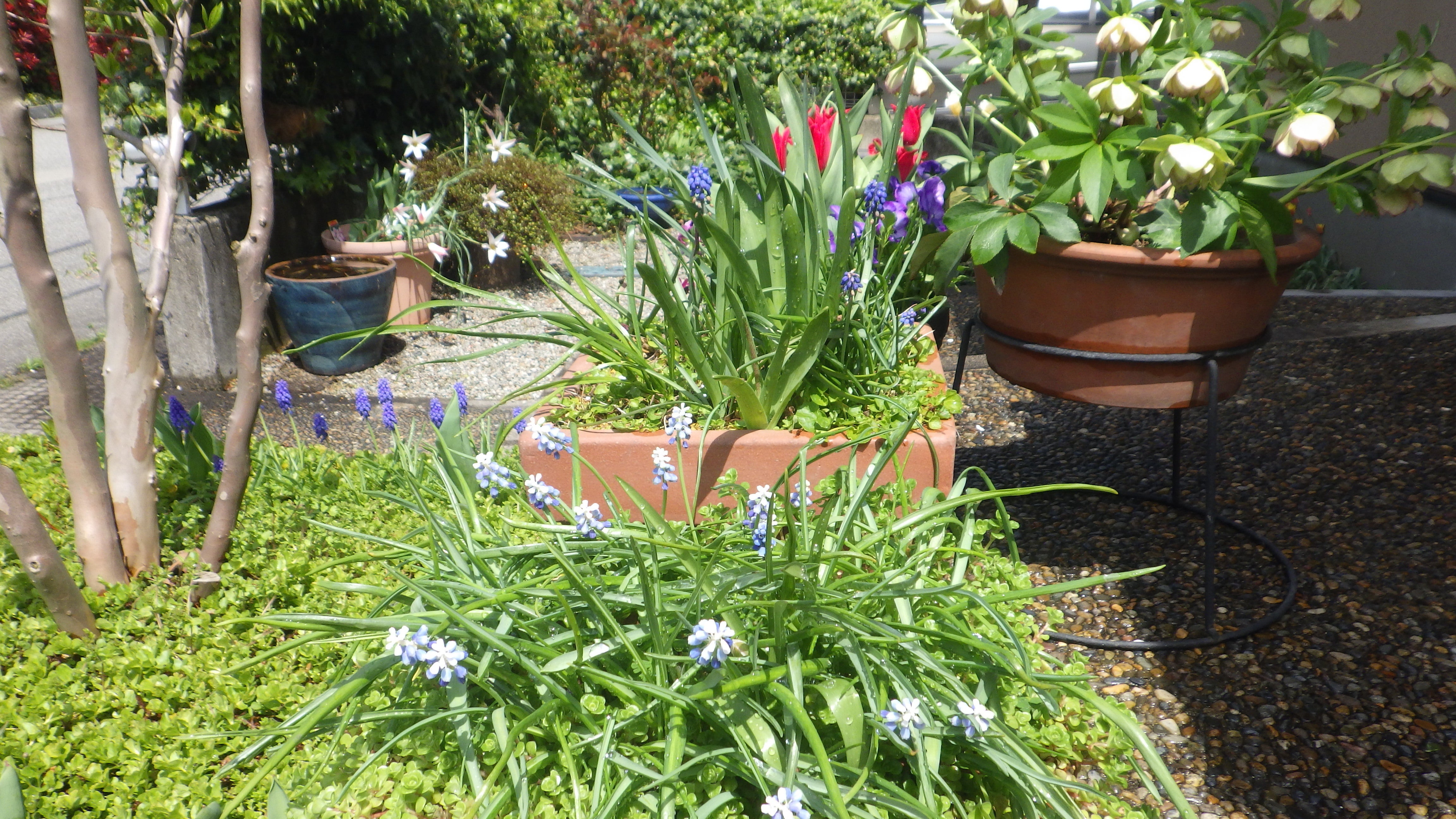 表紙画像のミニチューリップ(細長い黄赤色)は原種系でクリサンタという種類です。開花後種ができやすい種類で、その種をまくことで数年で球根が大きくなり咲いてくれたものです。少しづつですが群生になりつつあります。このエリアは日陰で初雪カズラをカバーにした花壇なので、夏場も涼しく水はけも良いので自然と球根も元気に育ってくれるんです。