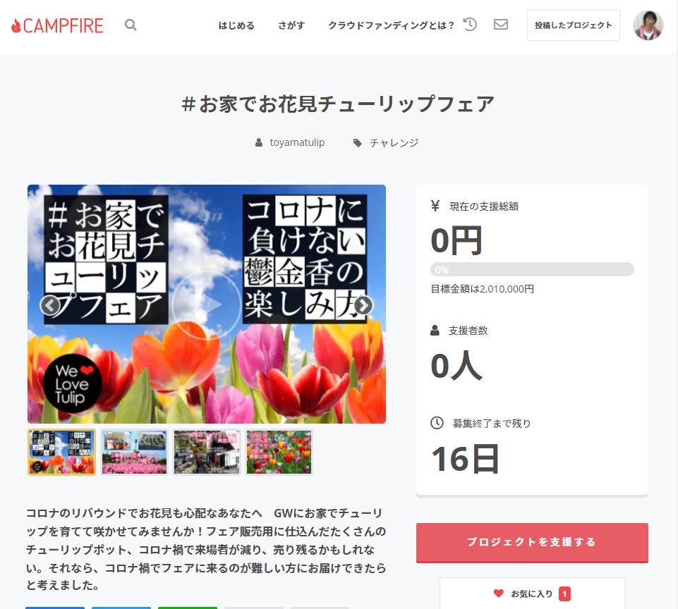 4月3日の支援開始から1週間がたち、多くのご支援を頂いておりますが、目標金額にはまだ到達していない状況です。4月18日までの申込期間となっています。ご支援いただきGWゴールデンウイークにもう一度チューリップを楽しんでみませんか!
