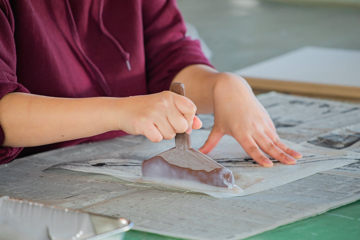 でんぷん糊という接着剤を全体に均一に広げ貼っていきます。でんぷん糊には水分が含まれており、和紙が水分を含むと破れやすくなるのです。