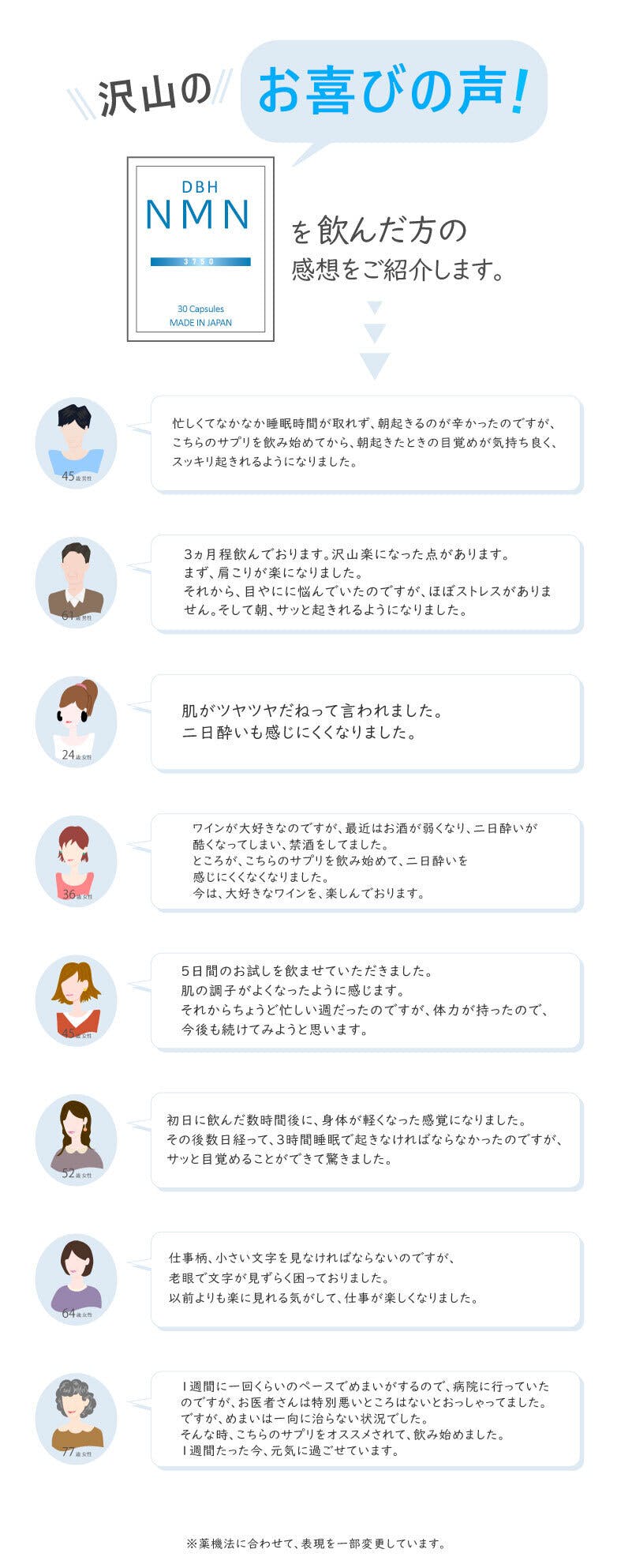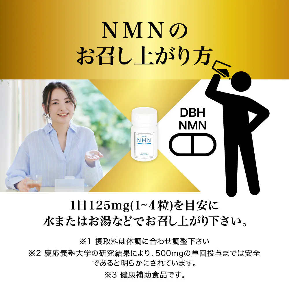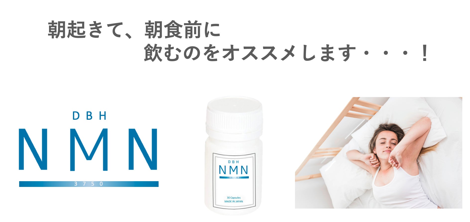 朝起きて、朝食を取る前に飲むのをオススメします!朝からNMNを摂取して、一日を気持ちよくスタートして下さい!皆さまの若々しさと健康を「DBH NMN 3750」がサポートします。