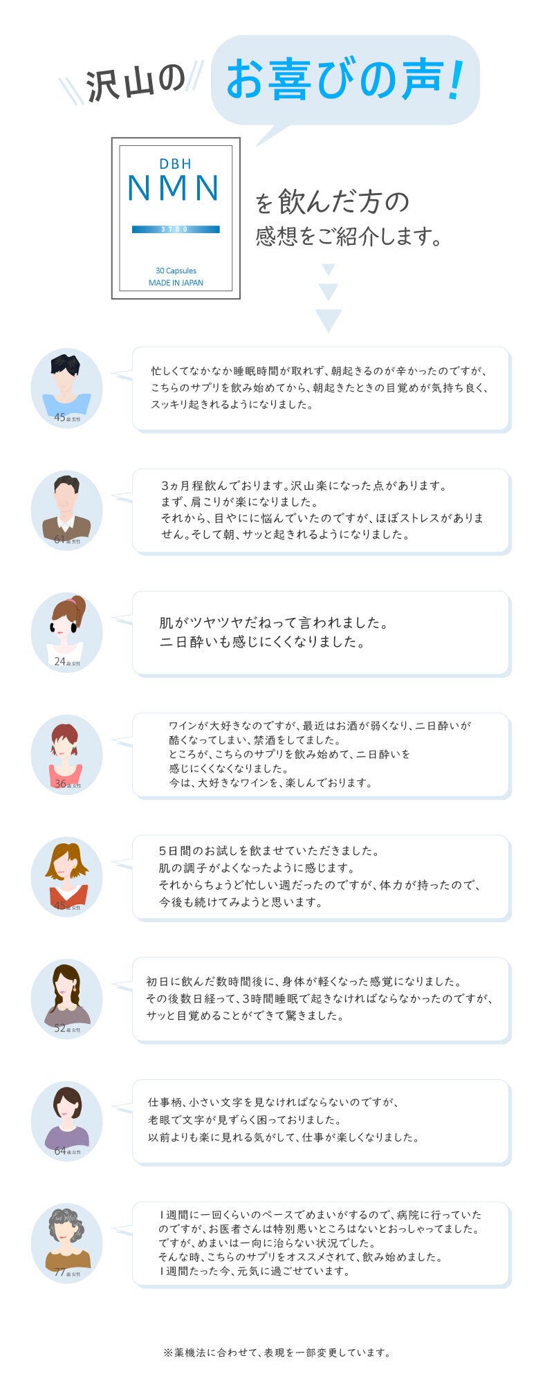 A.NMNは元々体の中に存在する物質で、加齢に伴い減少します。 それを補ってあげるのがこちらのNMNサプリメントですので、老化現象は人によって様々です。 得られる体感も、期間も個人差があります。