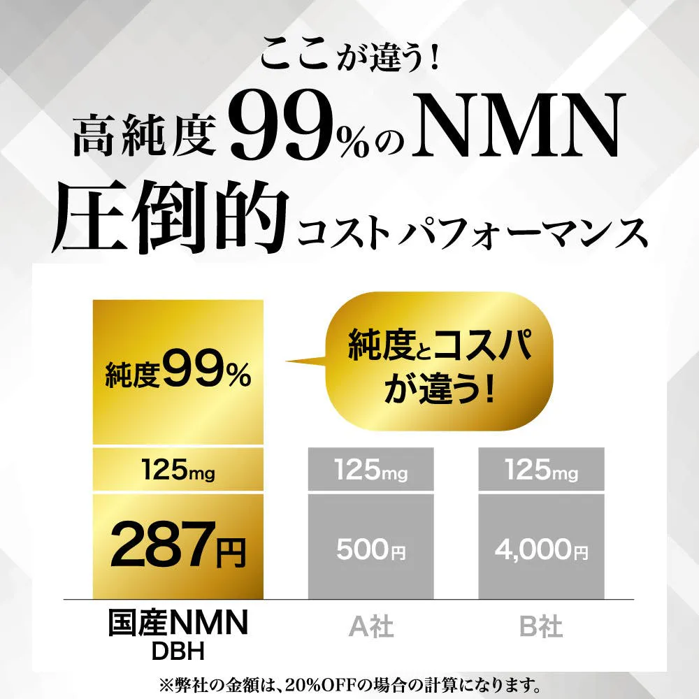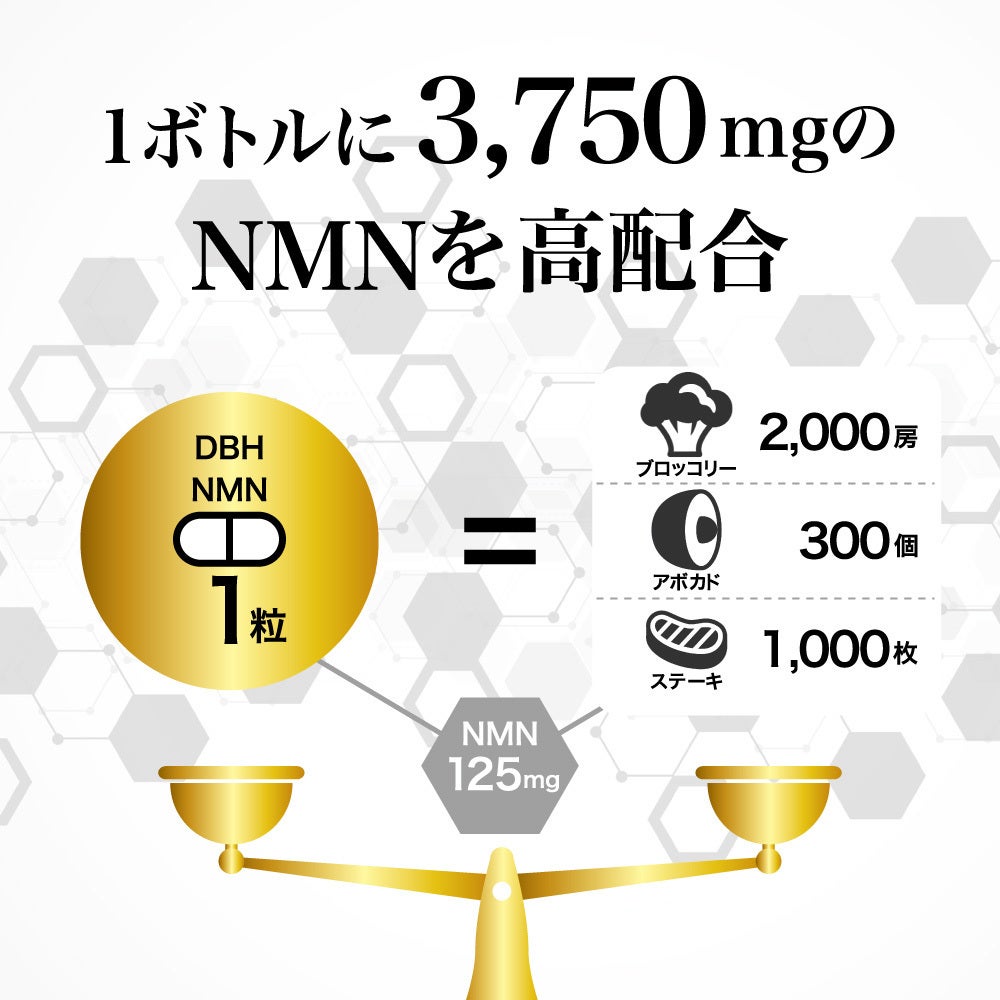 NMN高純度99%を、ぎゅっと1カプセルに125mg凝縮、1ボトル30カプセルで約1か月分