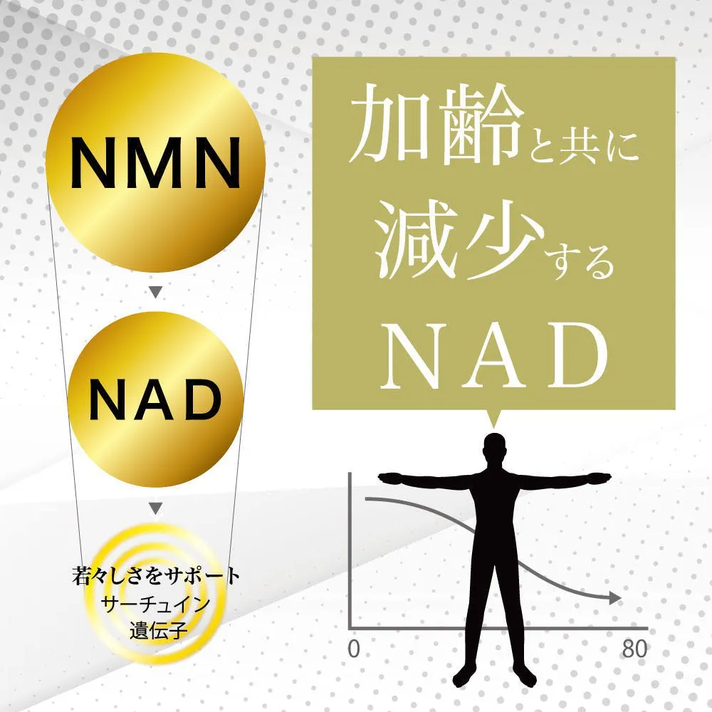 食べ物にも含まれてるNMNは、安心して摂取できるサプリメント(食品)です。 NMNは体内に摂取されるとNADに変化します。このNADがサーチュイン遺伝子に働きかけることで、抗老化作用があるのではという研究がなされてます。