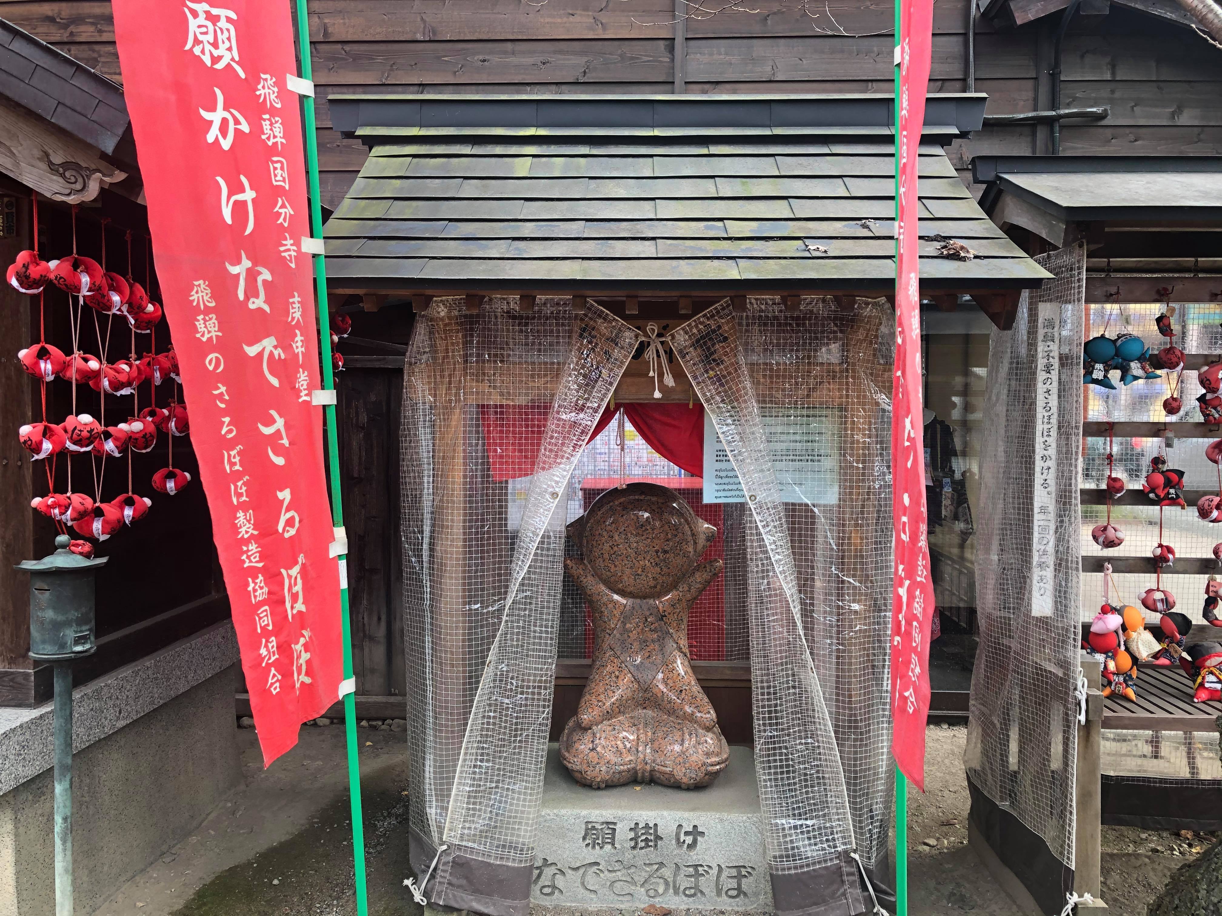 乳イチョウには「子育て地蔵尊」が安置され、昔から地域の子どもたちを見守っています。また、飛騨国分寺は「さるぼぼ」にも縁のあるお寺です。さるぼぼは飛騨高山のお土産品として有名ですが、もとは安産や幸せな結婚のためのお守り、子どもの健康を願うお人形でした。境内には「願掛けなでさるぼぼ」もあります。