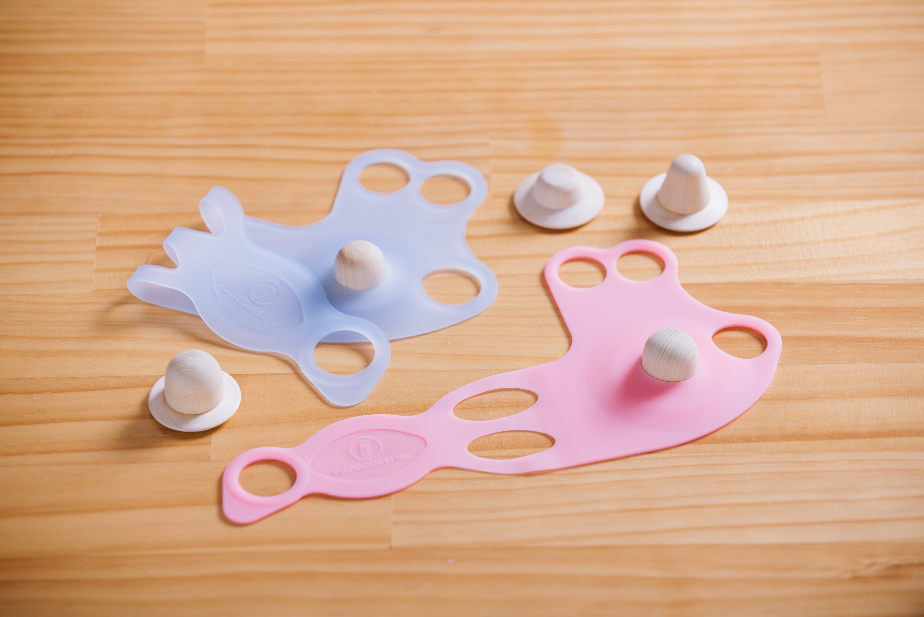リターン商品『SHIATSU BAND ぐりぐり』は”シリコン製のバンド”と”木製の圧し子”のセットでお届けします。