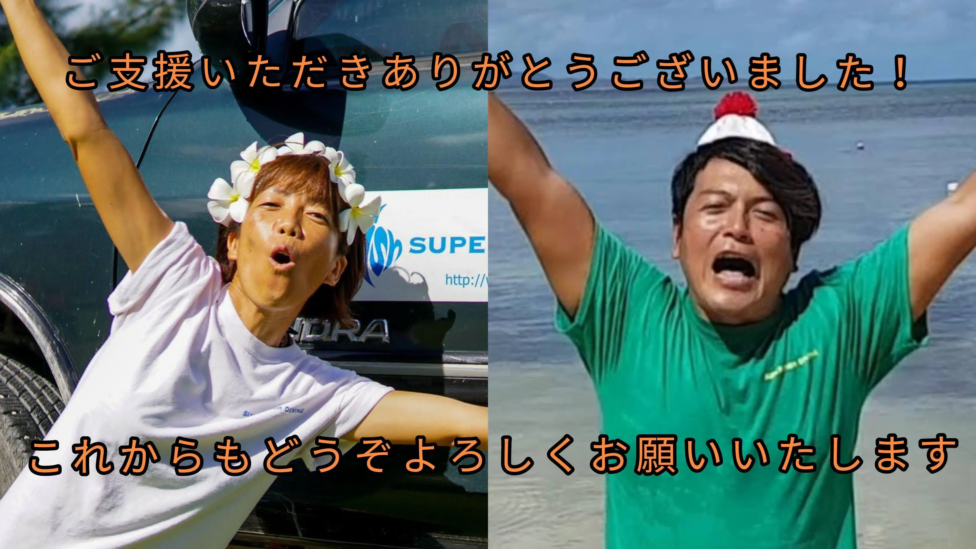 2021/01/26 13:12こんにちは!サイパンよりスーパーフィッシュダイビングです。この度は沢山の方に当店のクラウドファンディングにご協力、ご支援いただき誠にありがとうございました。昨晩無事にプロジェクトを終了いたしました。皆様からのご支援、応援のおかげで初日に目標としていた金額を達成し、最終的には目標支援額の2倍を越えた額となりました。こんな事があるのかと、嬉しさと驚きと感謝の気持ちでいっぱいです色々な感情がたくさん溢れて来ていてうまく言葉に表せられません。皆様のお気持ちが本当にありがたくて、ありがたくて。コロナの影響を受けて、飛行機なし、観光停止、観光客0名、で10ヶ月になろうとしています。。先の見えないトンネルの中を手探りで進んで来ました。観光の再開を待ち、不安に押しつぶれそうになりながらここまで来ました。何とか良い未来を思い描いて過ごして来ました。その中で今回のクラウドファンディングを立ち上げ、初日にして目標が達成、最後には目標の2倍という驚くべき結果となりました。そして全てお客様1人1人のお気持ちで、スーパーフィッシュダイビングをこんなにも大事に思って頂けるとは感激しきりです。これから私たちの出来る事としては、今回のご支援いただいたもので運営継続し、皆様がサイパンに帰って来れる場所を守り、笑顔でいっぱいに出来る様に、笑顔であふれる様に、観光再開に向けてしっかりと準備を整えて行きます。観光再開した時には1日も早く皆様にお会いしたいです。今回のご支援のお礼を、私達の気持ちをしっかりと目を見て、あらためて直接お伝えさせてください。そして今まで以上に皆様にサイパンを、ダイビングを楽しんでいただく為に誠心誠意ご案内させていただきます。これからもっともっと、サイパンをスーパーフィッシュダイビングを好きになってもらえる様にさらに努力を致します。何を伝えても、伝えきれないですが、本当に本当にありがとうございました。これからのスーパーフィッシュダイビングをご覧になって頂くことで皆様に恩返しをさせて頂きたいです。最高の笑顔と最高のおもてなしを持って皆様をお迎えしたいと思います。今後ともどうぞよろしくお願いいたします。名塚誉、石原美雪 もっと見るあと1日となりました!