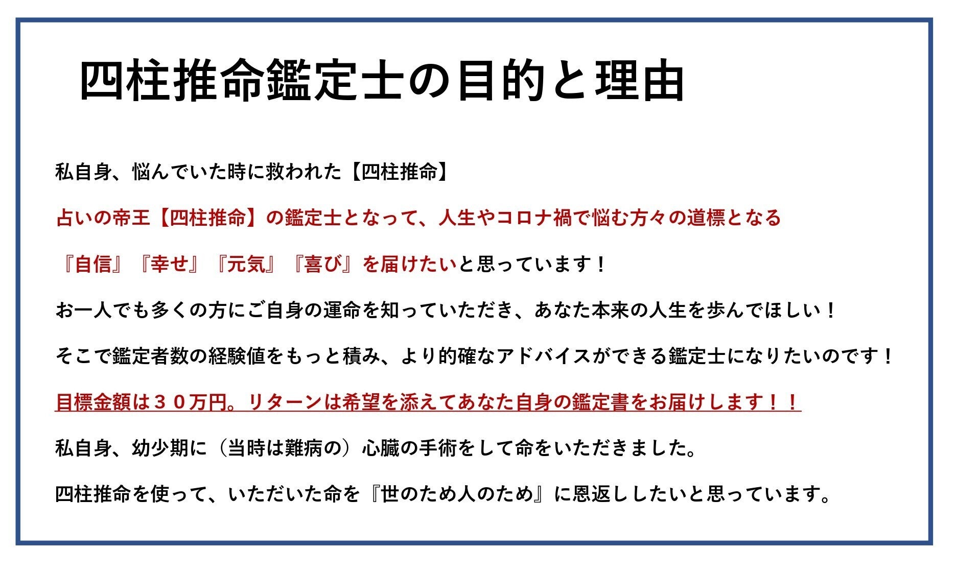 知人の勧めで始めた四柱推命鑑定士の勉強ですが、『私自身が悩みから救われた【四柱推命】を有効活用すれば、私にかかわっていただける方々のお役にたてるのでは!?』と思い、より的確なアドバイスができる鑑定士になるには、もっともっと鑑定者数を増やして精度や経験値を高めなければならない。との理由からクラウドファンディングにてリターンで鑑定させていただける方々を募らせていただきました。