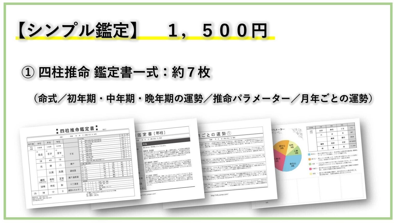 ※生年月日・性別から『命式/初年期(0歳~29歳)・中年期(30歳~59歳)・晩年期(60歳~)/推命パラメーター(あなたの強み)/月・年ごとの運勢』をPDFでお届けいたします。