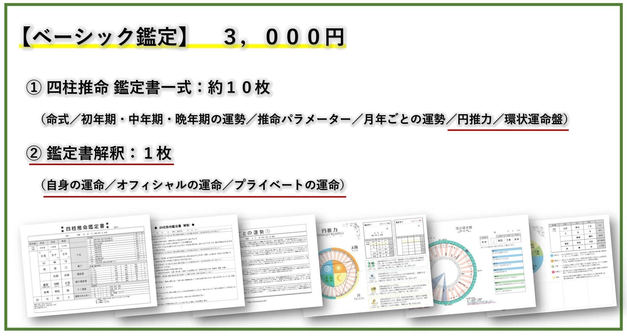 ※生年月日・性別から『命式/初年期(0歳~29歳)・中年期(30歳~59歳)・晩年期(60歳~)/推命パラメーター(あなたの強み)/月・年ごとの運勢/円推力(あなたの宿命)/環状運命盤(あなたの生涯の大運)/鑑定書解釈(あなたの運命の分析書です)』をPDFでお届けいたします。