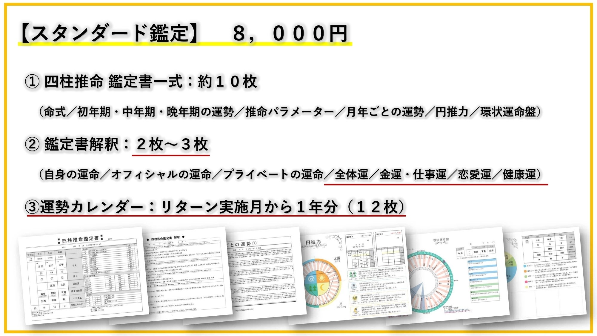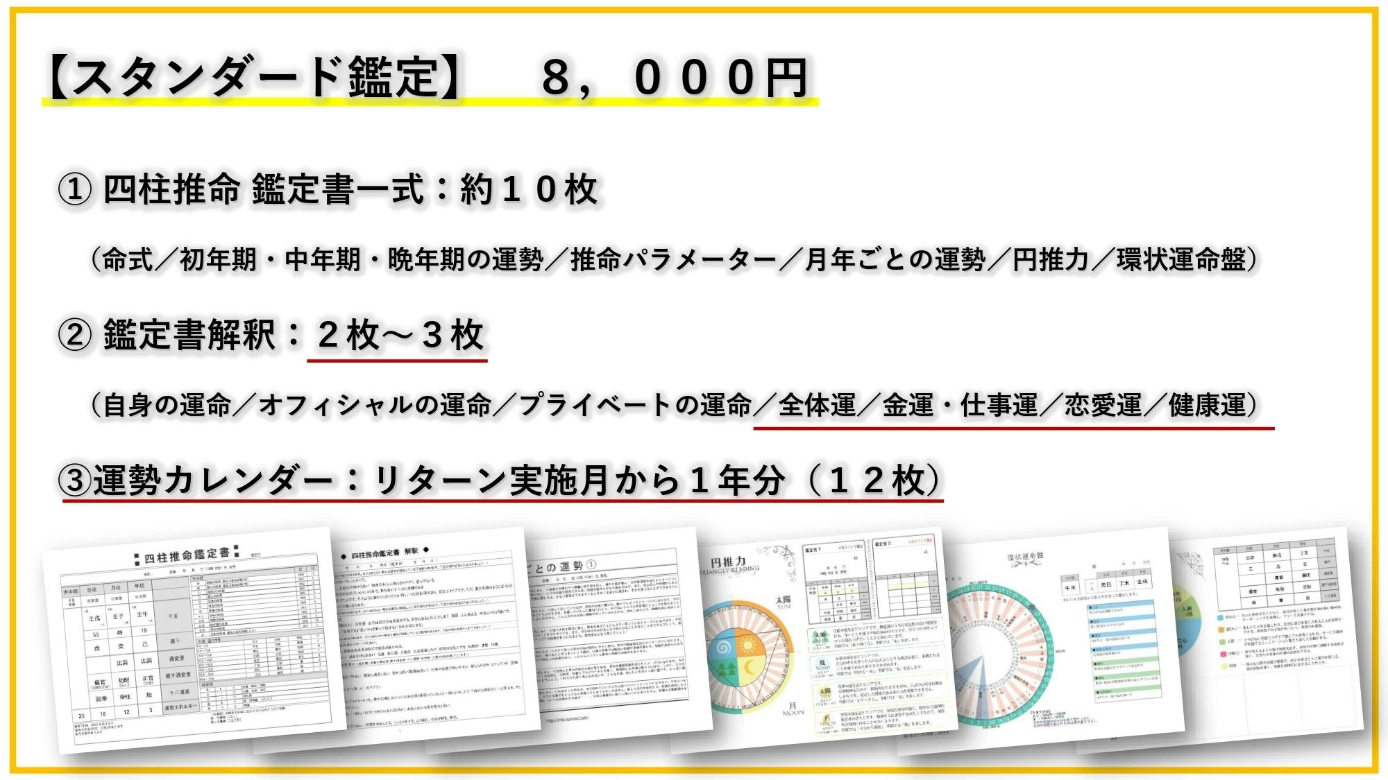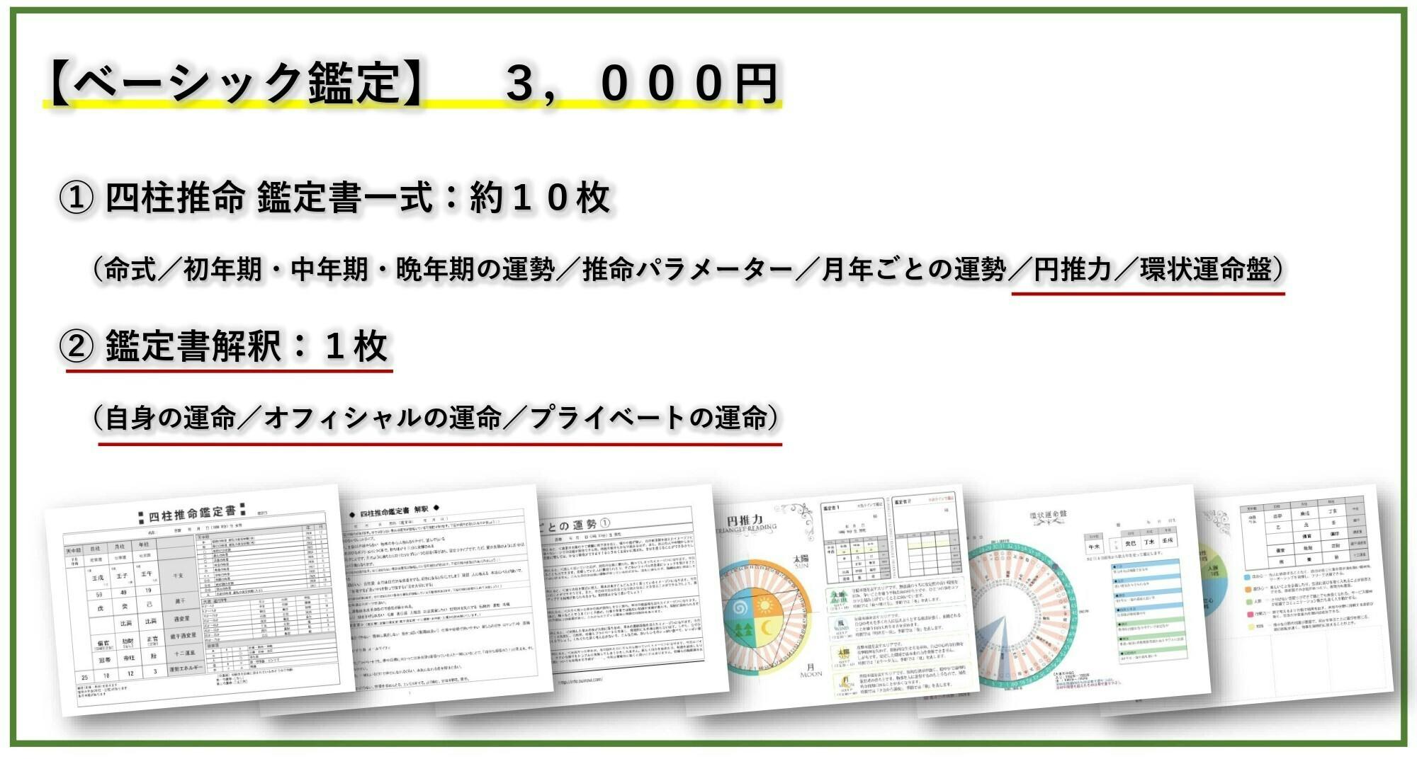 ※生年月日・性別から『命式/初年期(0歳~29歳)・中年期(30歳~59歳)・晩年期(60歳~)/推命パラメーター(あなたの強み)/月・年ごとの運勢/円推力(あなたの宿命)/環状運命盤(あなたの生涯の大運)/鑑定書解釈(あなたの運命の分析書です。ベーシック鑑定よりもより深く分析し、全体運・金運・仕事運・恋愛運・健康運も記載しています)』『毎日の運勢カレンダーを1年分』をPDFでお届けいたします。