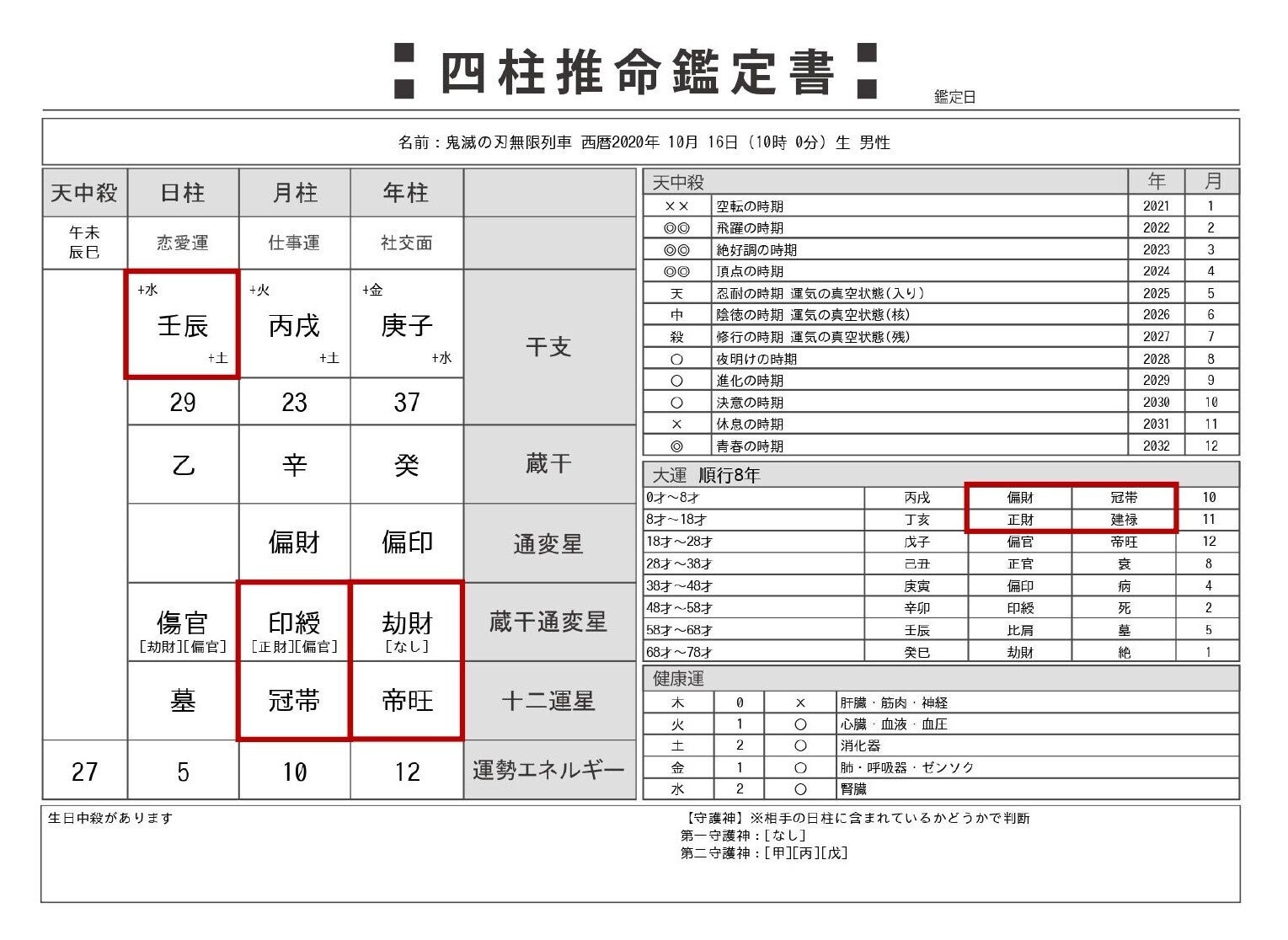 2021/01/03 11:53こんにちは。matsu0710です。今回は「劇場版『鬼滅の刃』無限列車編」を四柱推命で占ってみました。煉獄さんが歴代1位の男に! おめでとうございます!私も4回見に行きました。。。毎回(涙)公開日(2020年10月16日)を元に、四柱推命的に大ブレイクした要素を見ていきたいと思います。添付画像をご覧ください。①【壬辰】(日柱と干支)【壬辰】は特殊干支と呼ばれる内の一つで、《魁ごう》になります。意味は『絶対に降参しない驚くほどの意志力・幽霊をも吹き飛ばすほどのパワーの持ち主』ま、まさに竈門炭治郎やその仲間たち、そして柱のことではないでしょうか・・・!②十二運勢に【帝旺】【冠帯】【帝旺】は男性を対象にして成功【冠帯】は女性を対象にして成功みんなが対象になってます。③年柱では最強運勢の【劫財・帝旺】の組み合わせ事業で大成功を収める方に多い最強運勢です。。。④【印綬】教養・優しい・思いやりがある星になります。まさに、竈門炭治郎!⑤大運【偏財】【正財】8年間は【偏財】、その後10年間は【正財】となっていて、最初は人とお金がどんどん入ってきて循環していき、その後は着実な人気を保ち続けるという運勢と読み取れます!凄いです。ーーーーーーこのことから四柱推命で公開日を決めたとしか考えられません!! 映画の公開日、歌手のデビュー日、会社の設立日など、何かが生まれる時にその日のエネルギーが宿命になるといわれています。ますます鬼滅の刃から目が離せませんね!!最後までご覧いただきありがとうございました。 もっと見る