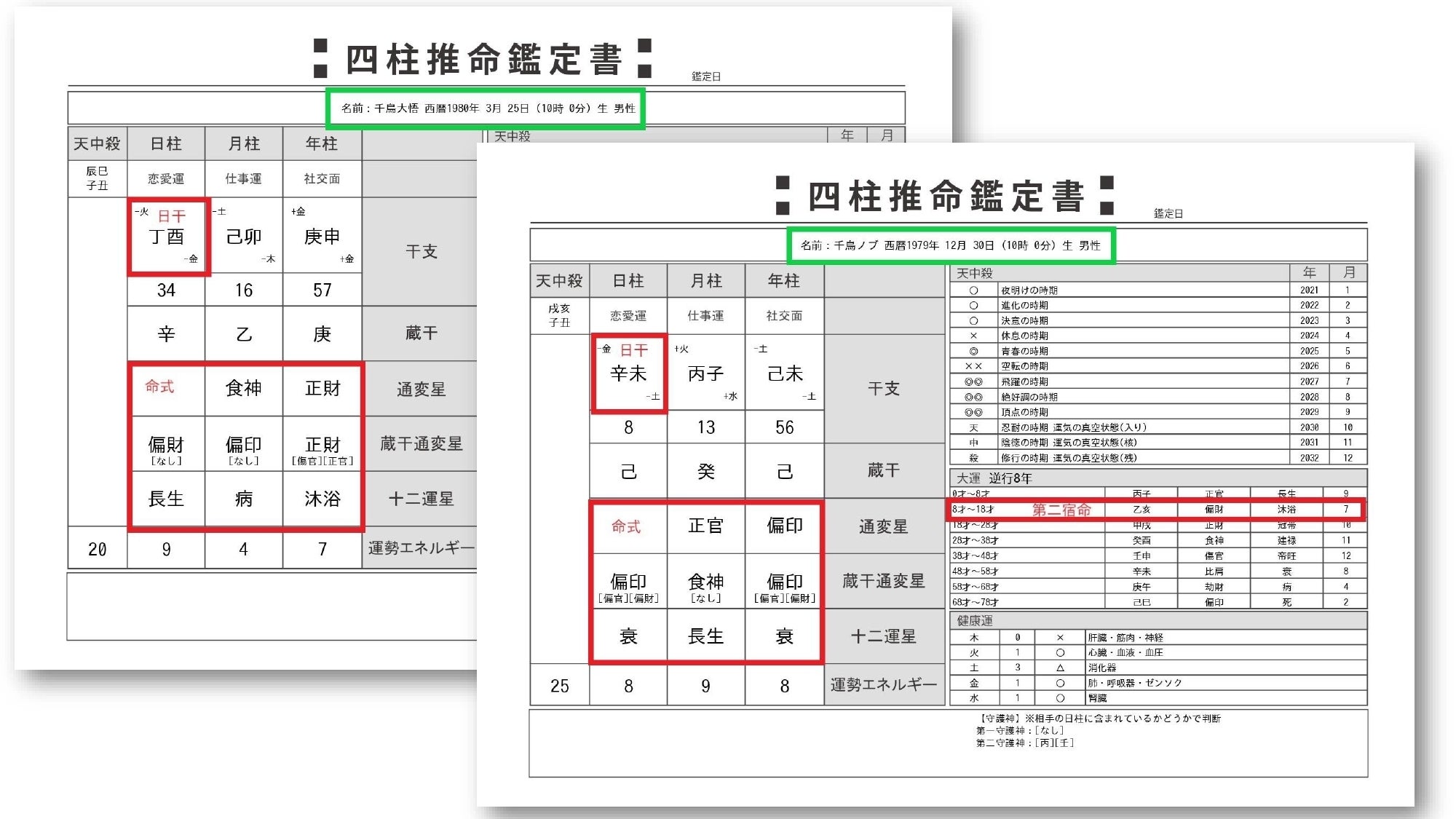 金運・仕事運/健康運/恋愛運/社会運/自分の性格・長所短所/先祖から受け継いでいる性格/強み弱み/思考の傾向/30歳までの運・60歳までの運・60歳以降の運/人との相性 など