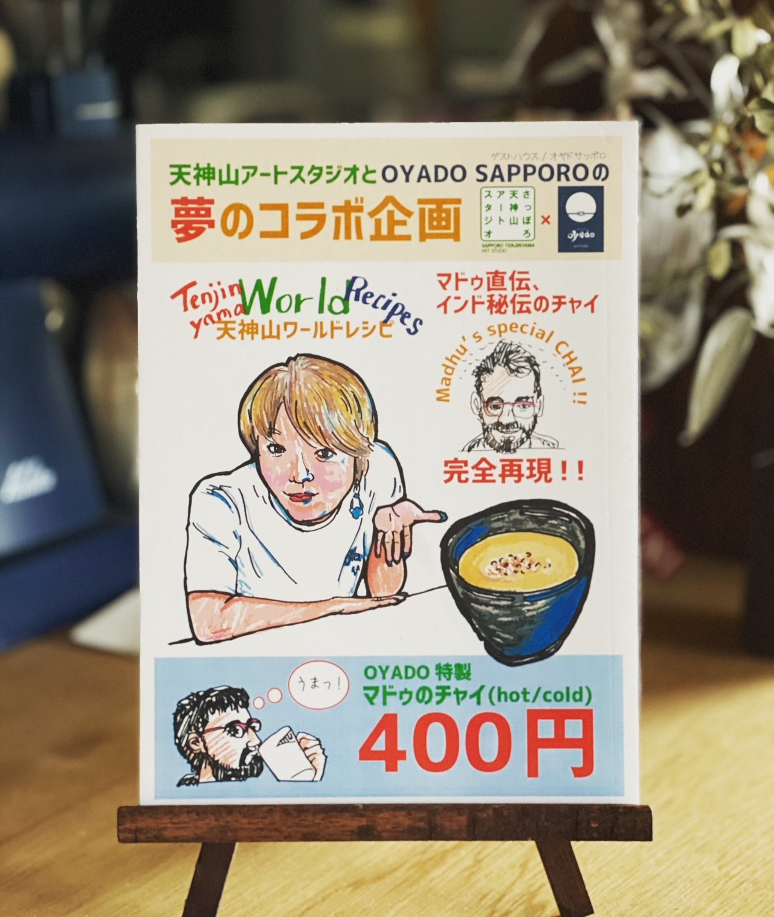 本日は、これまでのOYADO SAPPOROでの活動をご報告いたします。初年度より、ニセコを活動拠点にしているIKIYAさんに年に2回ほど水引で作ったアクセサリーの物販及び制作体験をお願いしております。IKIYAのオーナーさんのセンスも良し!トークも良し!なもんで、こちらは毎回かなり評判のイベントです。水引に興味のある方や、ご近所のお子さんもお越しになってワイワイと楽しいイベントです。OYADO SAPPOROに飾ってある、水引の大きなタペストリーもIKIYAさんにお願いして制作していただきました。そして昨年は、天神山アートスタジオさんとのコラボ企画!World recipeを開催!!OYADO SAPPOROではインドのアーティストさん直伝のチャイを作って皆さんにご提供しております。それにしても・・この似顔絵の女将、そっくりすぎて怖いですね。さて、今年の予定はっ!!ドッグカフェ経営を目指すKちゃんの間借りカフェin OYADO.3月か4月の毎週土曜にメキシカンホットドッグを提供予定です!更にもう1つ!平岸在住のイギリス人の方ご協力の元、語学イベントができそうです。こちらは恐らく月1開催になると思います!2021年も、できることからコツコツと皆さんと楽しみながら成長していきたいと思っています。