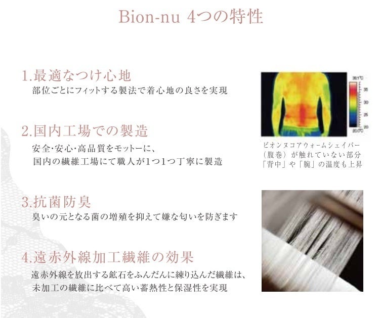 Bion-nu(ビオンヌ)のアイテムは、遠赤外線を放出する天然鉱石を、特殊な技術で超微粒子へと加工。その粉体を糸へふんだんに練りこみ、鉱石の密度の高さを実現するため、2本の糸を撚り合わせる「双糸(そうし)」という製法を採用。生地にプリントしているのではなく、直接糸に練り込んでいるため、鉱石が剥がれ落ちず、洗濯を繰り返しても遠赤外線効果が長続きするので洗い替え意外は書い直す必要がないのも魅力です。