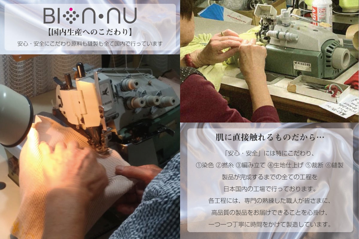 肌に直接触れるものだから、「安心・安全」には特にこだわり、①染色②撚糸③編み立て④生地仕上げ⑤裁断⑥縫製 製品が完成するまでの全ての工程を日本国内の工場で行っております。