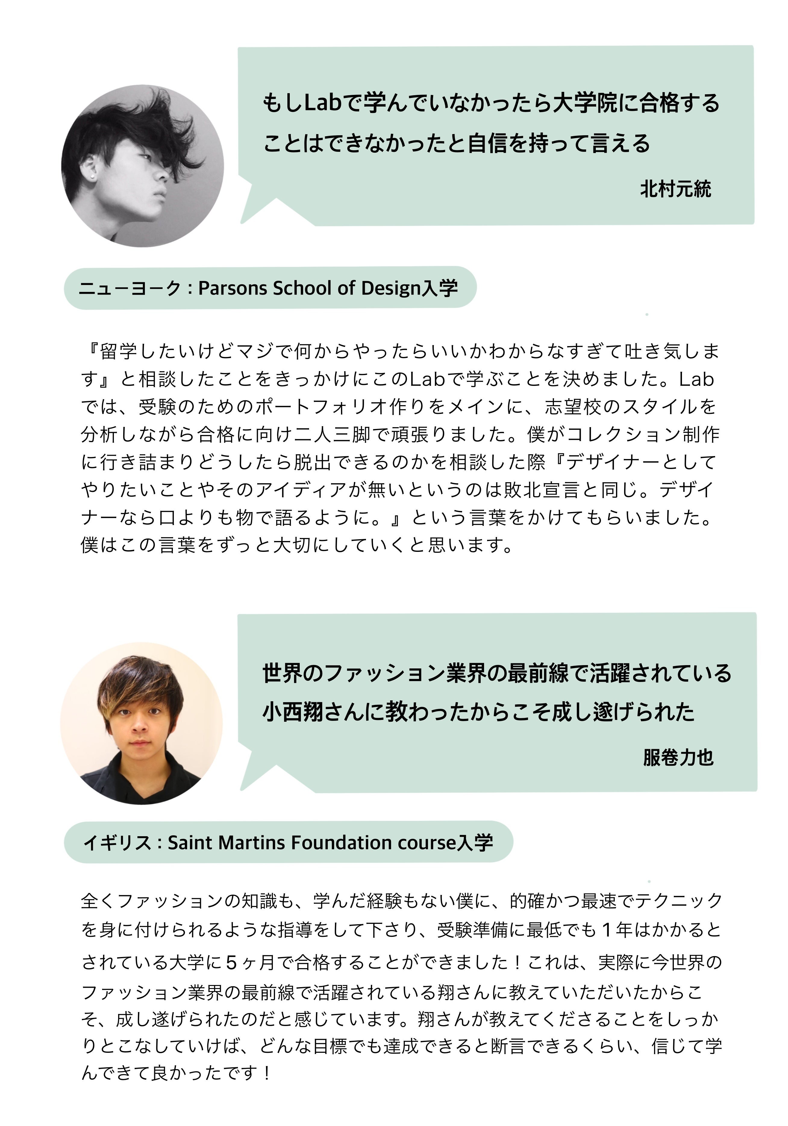 これらをサポートしています。この3年間でイギリス、フランス、アメリカ、ベルギーなど世界トップクラスのファッション学校へと生徒を輩出してきました。そのうちの数名は奨学金を獲得し、夢の留学を果たしています。