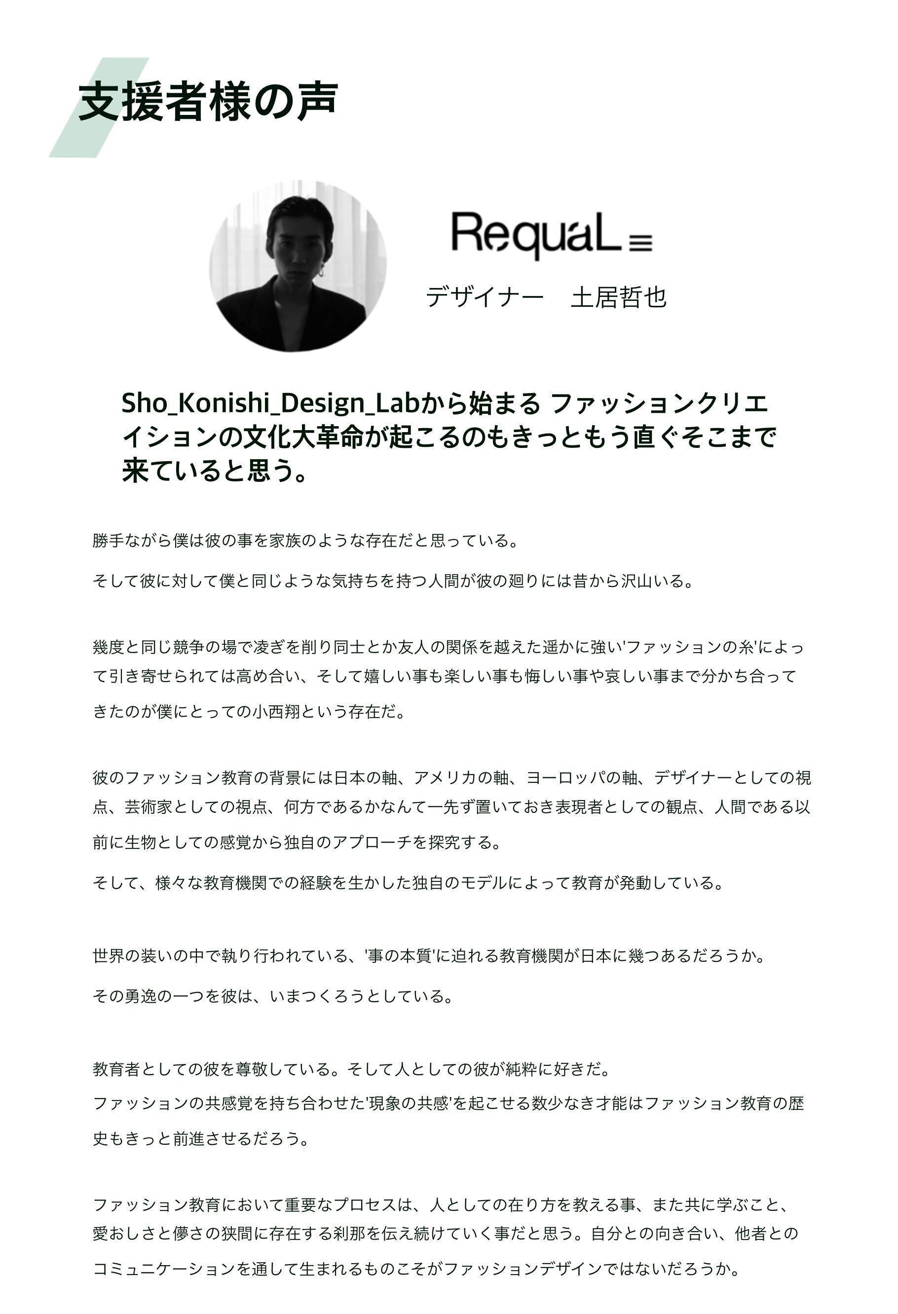 Sho_konish_Design_Labを立ち上げるにあたり、とても大切なもう一つの想いがありました。それが、「ファッション留学を夢見る若手のサポートがしたい」という気持ちです。僕自身、裕福な家庭で生まれ育ったわけではなく、留学をしたいという思いを両親に伝えたところ金銭的な面から何度も断られました。それでも夢を諦められなかった自分は奨学金に応募し、たくさんの方々に支えられながら現在に至ります。