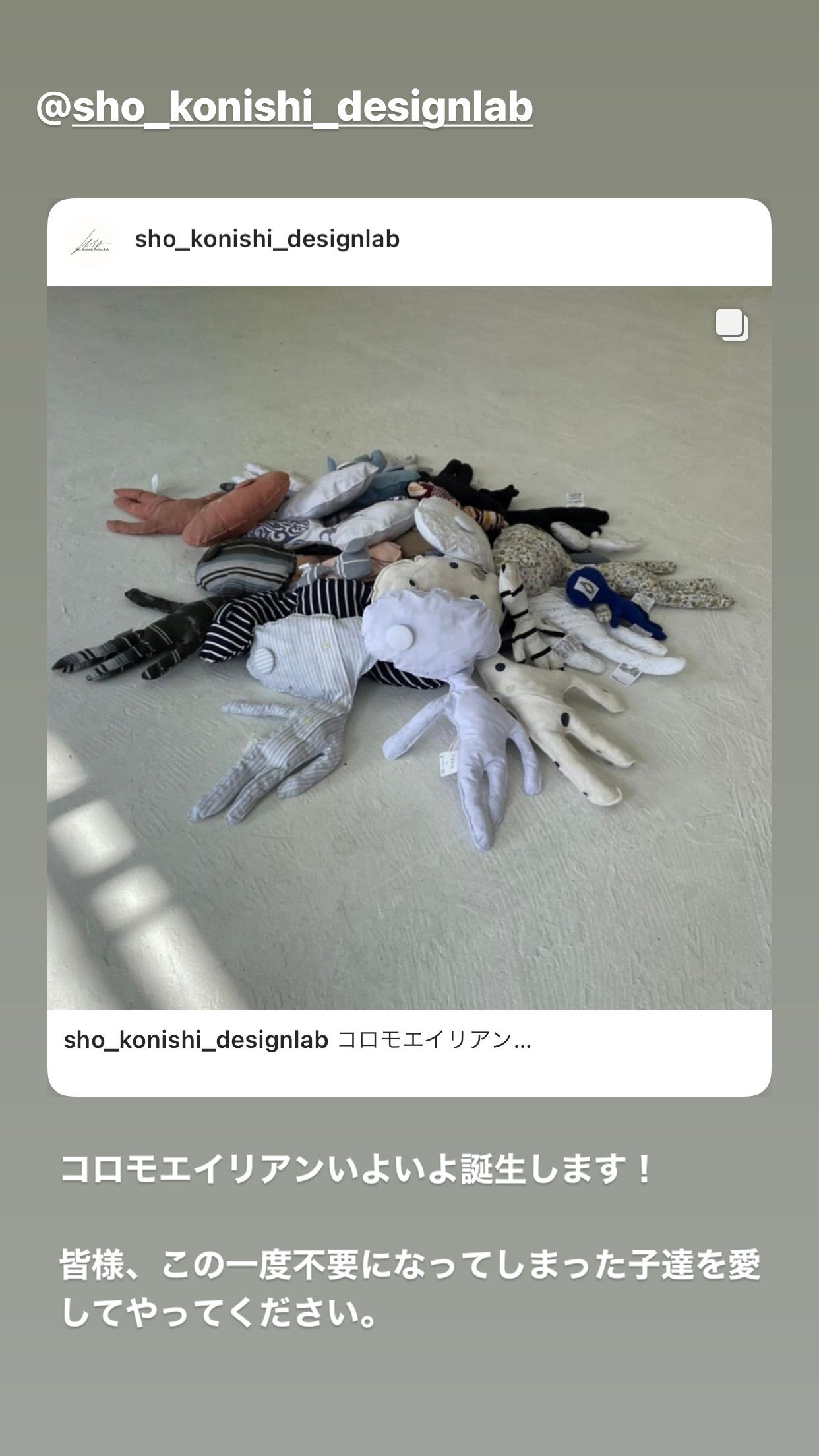 2021/03/10 14:44支援者の皆様お世話になっております。デザインラボスタジオの活動報告です!コロモエイリアン誕生します!デザインラボスタジオでは要らなくなった服を回収して新しい命を育む取り組みをしています。サスティナブルをテーマに活動をしていくラボスタジオの第一の取り組みになります。消費され続ける服の存在価値に見直しを。服に感情を持ってもらえるように。そんな想いからこのコロモエイリアンは誕生しました。服を創り変え、再び愛される存在に。中身も全て生まれ変わり作業時に出る残布を使用しています。”衣”の生まれ変わりの宇宙人。コロモエイリアンを皆様どうぞよろしくお願いします!13日〜先行販売します!一点一点、服の個性を活かしたクラフトメイドになります。大人から子供まで、皆に愛される存在になるますように、、、。#デザインラボオリジナルデザイン @sho_konishi もっと見る