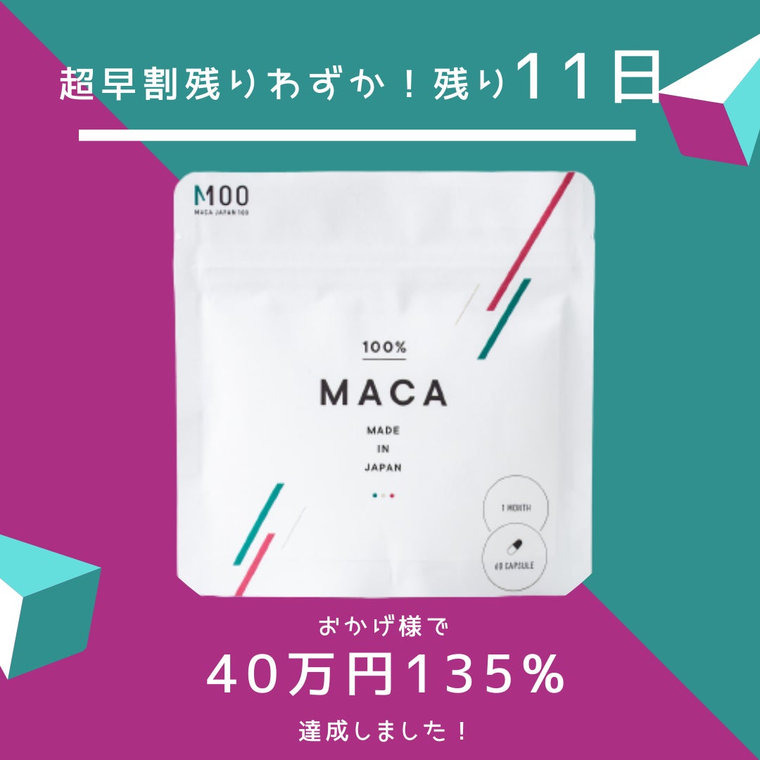 みなさまに支えていただいた本プロジェクトも残り10日ほどとなりました!ここまで多くのご支援、応援ありがとうございます。今日は、私が使ってみた国産マカ100%のMACA JAPAN 100がおすすめポイントをご紹介します。<MACA JAPAN 100のおすすめポイント>●朝すっきり起きられる!朝が弱い方なのですが、目覚ましなしでもスッキリと起きられるようになりました。●二日酔いを感じなくなった!ちょっと飲みすぎたなってひでも翌日に響かないのがびっくりです!●1日中元気!朝早起きになり、日中も元気だから1日にできることがグッと増えました。リラックスに使える時間や家族との時間も増えたためとてもいい日々が過ごせています。私が実感したことなので、個人差もあると思いますがやはり飲んだ日とそうでない人の差は明確に感じます。ご自分はもちろん、周りの頑張りすぎているあの人にお裾分けしてみてはいかがでしょうか!今なら超早割が30個ほどございますインスタグラムも随時更新中ですので是非ご覧ください。フォロワーも2,000名超えました^^https://www.instagram.com/maca.japan100/最後まで精一杯頑張りますのでどうぞよろしくお願いします!