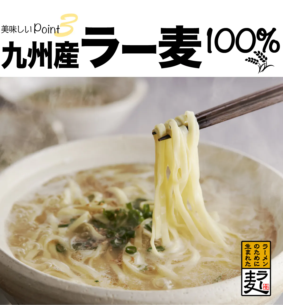 ラーメン県福岡がラーメンのために生み出した「ラー麦」。その素材を活かした福岡県産ラー麦100%麺。コシが強く、歯切れがよいのが特長で、お鍋の〆にもよく合います。