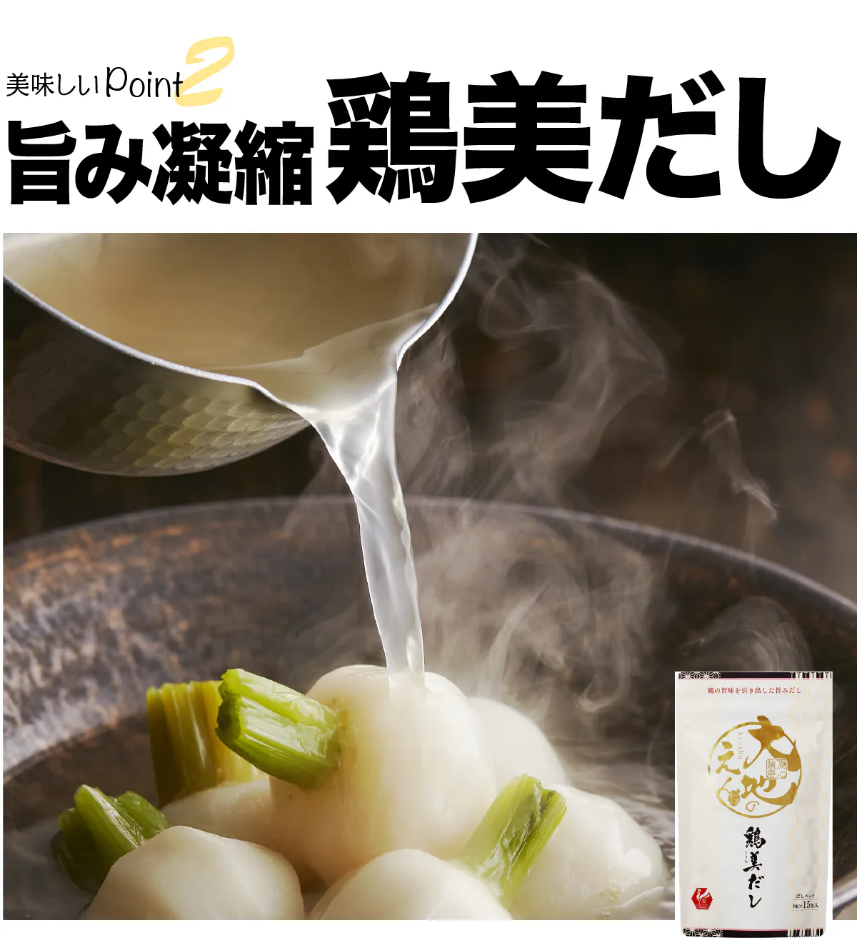 【“鶏の旨味を引き出した白濁の旨みだし”鶏美だし】を加えると、より深い旨みが味わえます。