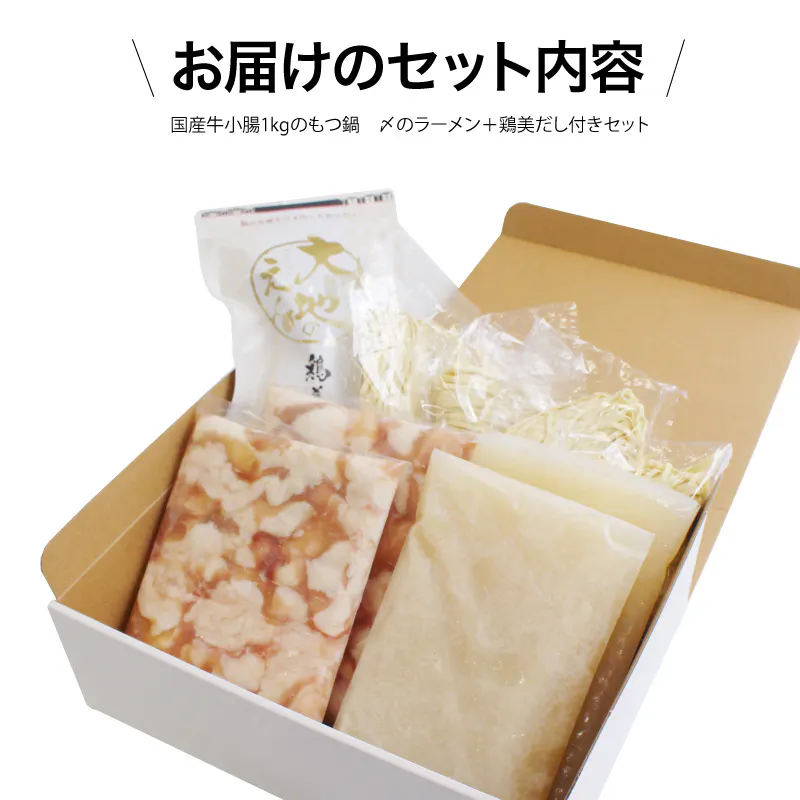 ■ 国産牛小腸1kgのもつ鍋 〆のラーメン+鶏美だし付きセット(8〜10人前)