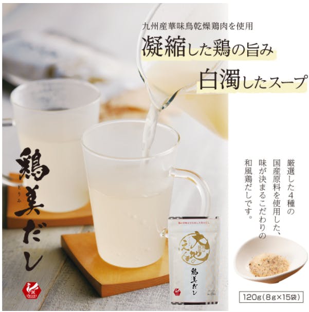 2021/04/30 20:36鶏の旨みが効いてる 絶品鶏美だし!! 厳選素材で料理もおいしく!今日は鶏美だし15包のご紹介です。このお出汁、ただのお出汁じゃないんです!①特徴:肉の旨味を引きだし白濁の旨みだし! 博多の郷土料理 水たきからうまれた白濁のうまみだし! 2~3分煮だして、パックをお箸でつまんで振り出すと白濁して まさに水たきスープのよう! このスープがお肉料理によく合うんです!スープとしてもおすすめです!②特徴:国産の厳選素材を4種類! 4種の国産素材を乾燥させ粉末にしたものを、出汁パックに入れて 使いやすいように包んでおります。4種の産地は九州を中心とした素材を 厳選しております。 1)九州産華味鳥乾燥鶏肉、2)宮崎県産椎茸、 3)鹿児島県 枕崎産鰹節、4)北海道産昆布 ③特徴:簡単手軽にプロの味! 水から煮だして2~3分で簡単手軽にプロの味に。 お箸でつまんでふり出すとよりおいしく仕上がります。 お箸でつまんでふり出して白濁のお出汁が出来上がり④アレンジ色々 スタッフおススメ アレンジ方法 ⑤厳選「鶏美だし唐揚げ」レシピ ●材料(4人分) 鶏肉300g 鶏美だし1包 ゴマ油小さじ1 薄力粉大さじ2 片栗粉大さじ2 焼き油大さじ3 1)鶏肉を一口大に切り、鶏美出汁の中身と一緒に袋に入れ、よく揉みます。 10分ほど時間を置き、味をなじませる。 2)1)にゴマ油を加え、よく揉む。薄力粉と片栗粉を合わせて肉にまぶす。 ※衣にゴマ油を入れるとカラッと揚がり、油っぽくない! 3)フライパンに油大さじ3を入れ、弱火にかける。フライパンが温まったら 鶏肉を皮を下にして入れる。焼き色がついたら、裏返して 2~3分加熱して完成♪皆さんも色々試してくださいね。プロジェクト担当:西 もっと見る